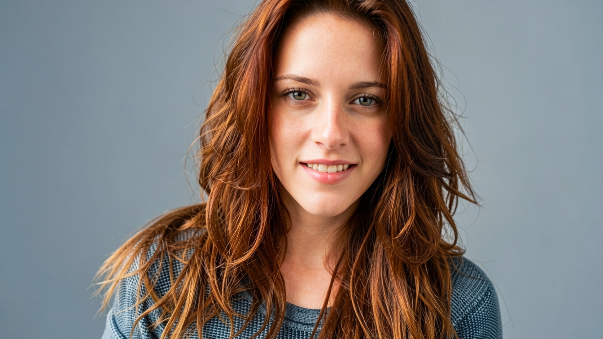 Портрет Кристен Стюарт с рыжими волосами на сером фоне