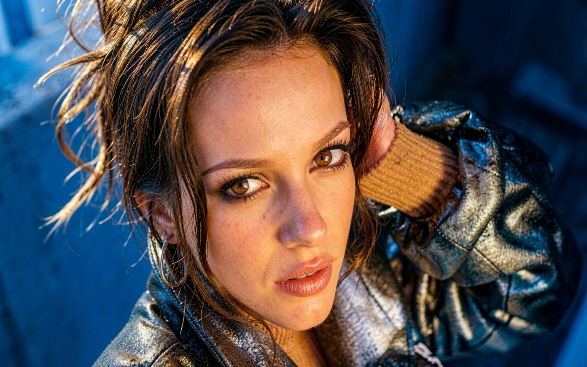Портрет девушки в серебристой куртке при солнечном свете