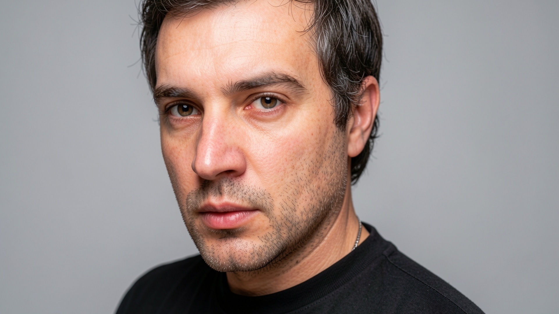 Портрет мужчины в черной футболке серый фон