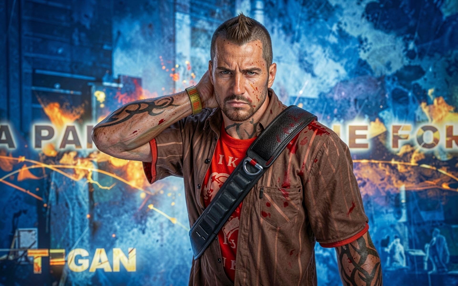 Мужчина в коричневой рубашке постапокалиптический стиль
