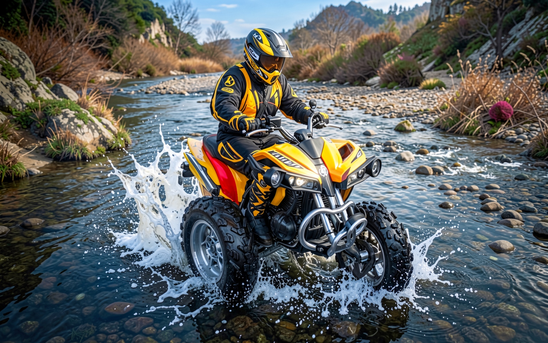 Желтый квадроцикл в горном потоке воды