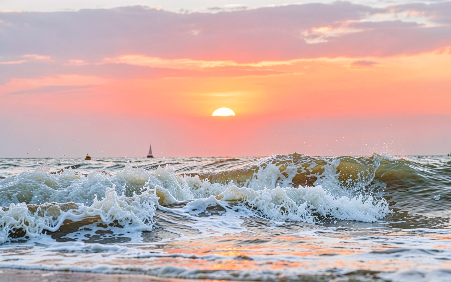 Закат над морским прибоем с парусником