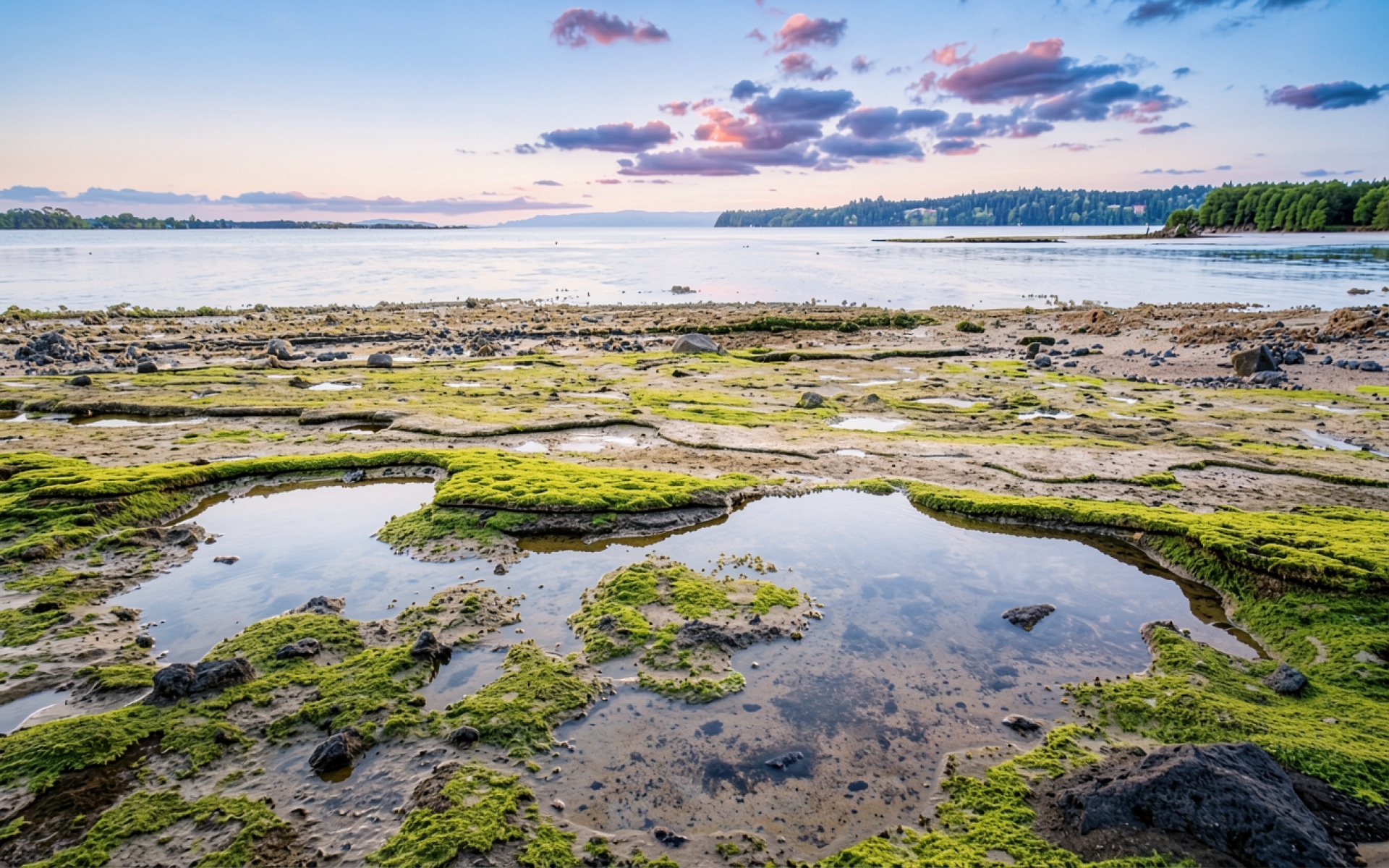 Прибрежная зона с зеленым мхом и лужами