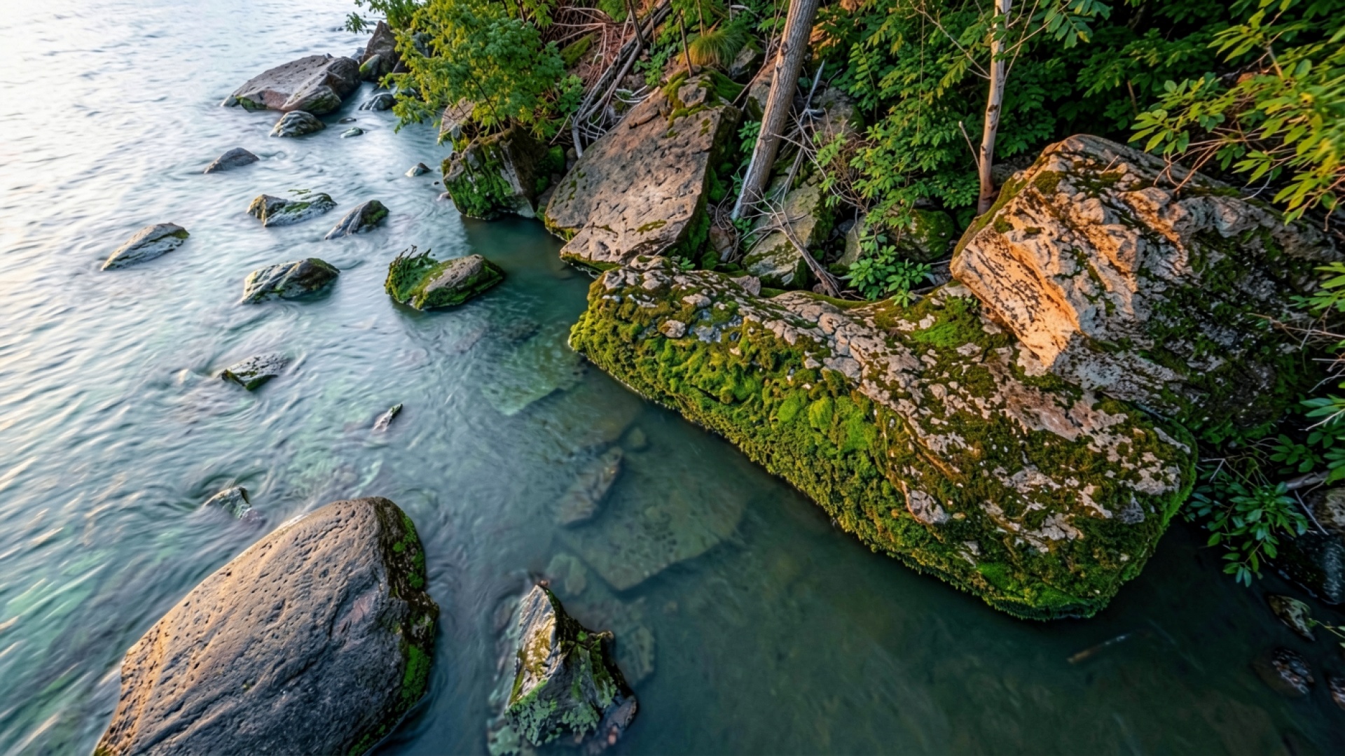Каменные валуны в мшистом прибрежном лесу