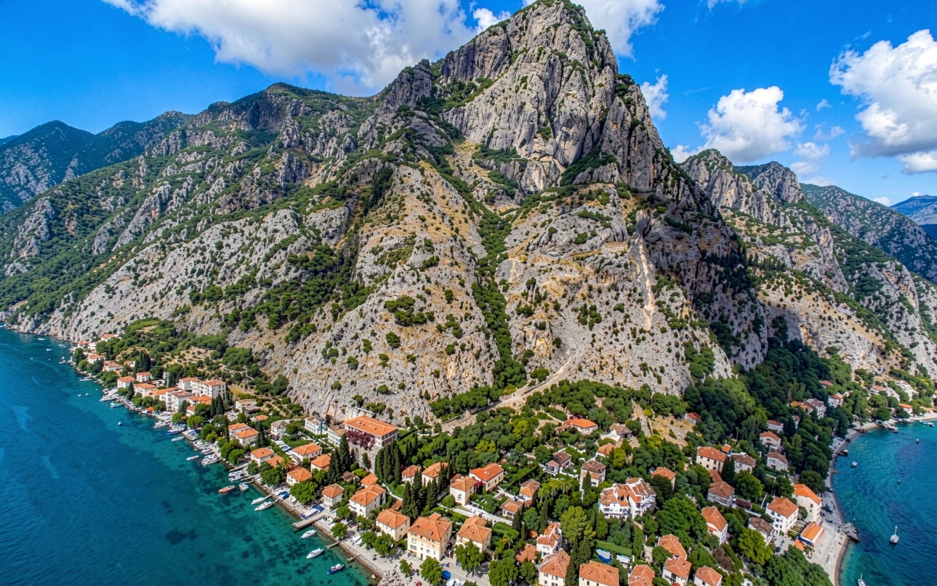 Прибрежный город у подножия серых скал