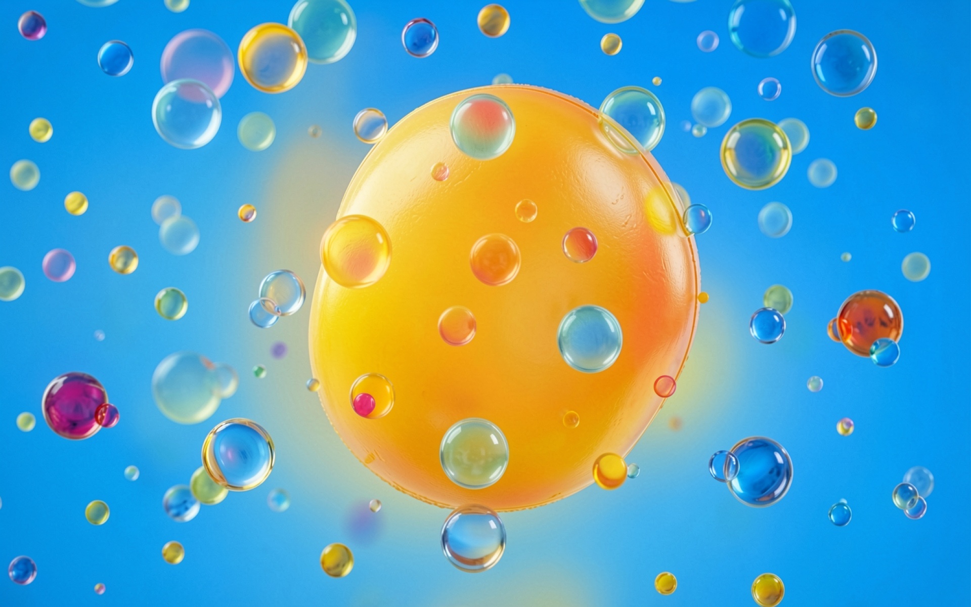 Желтая сфера в окружении прозрачных пузырей