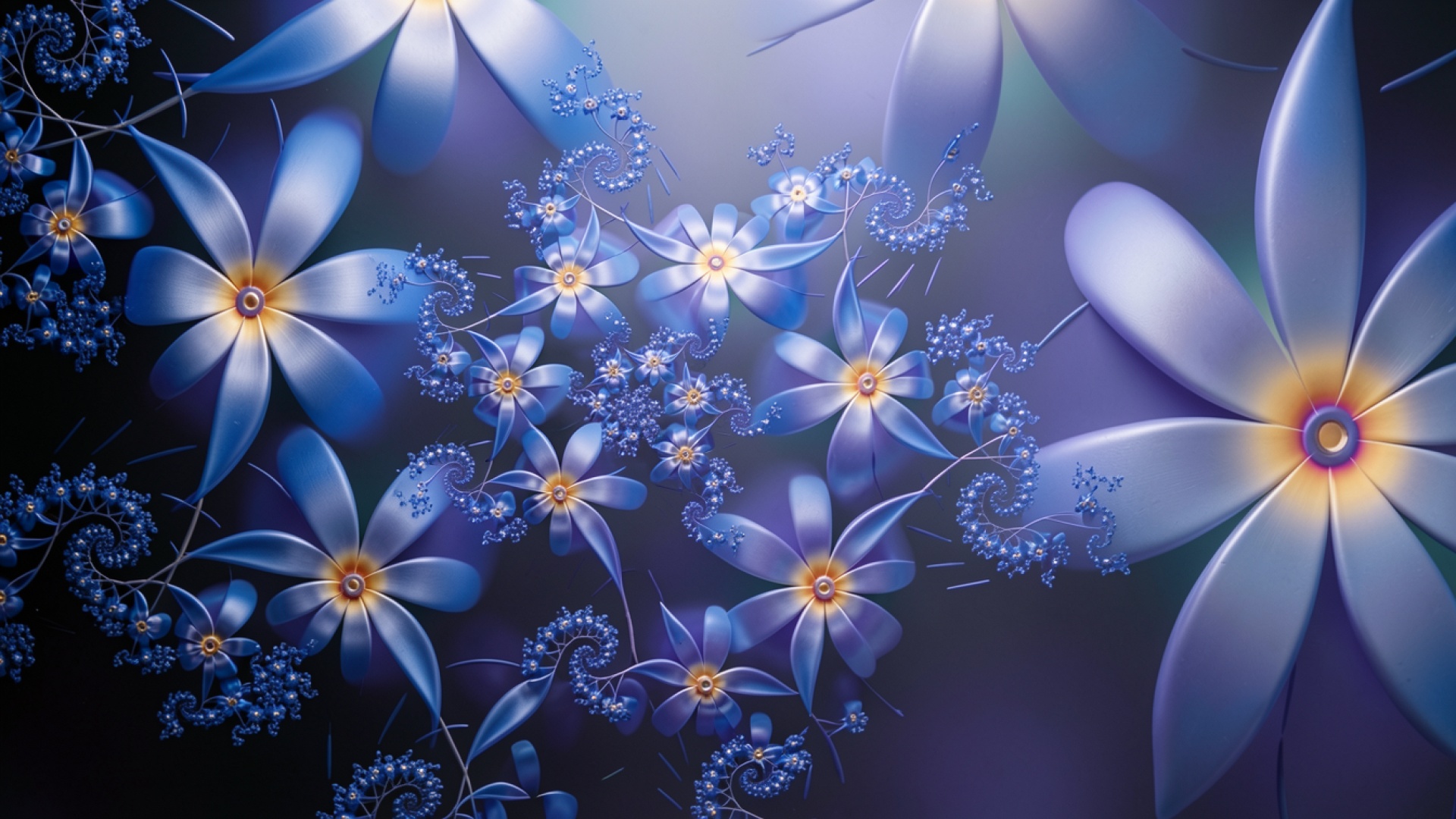Синие фрактальные цветы в темном цифровом пространстве