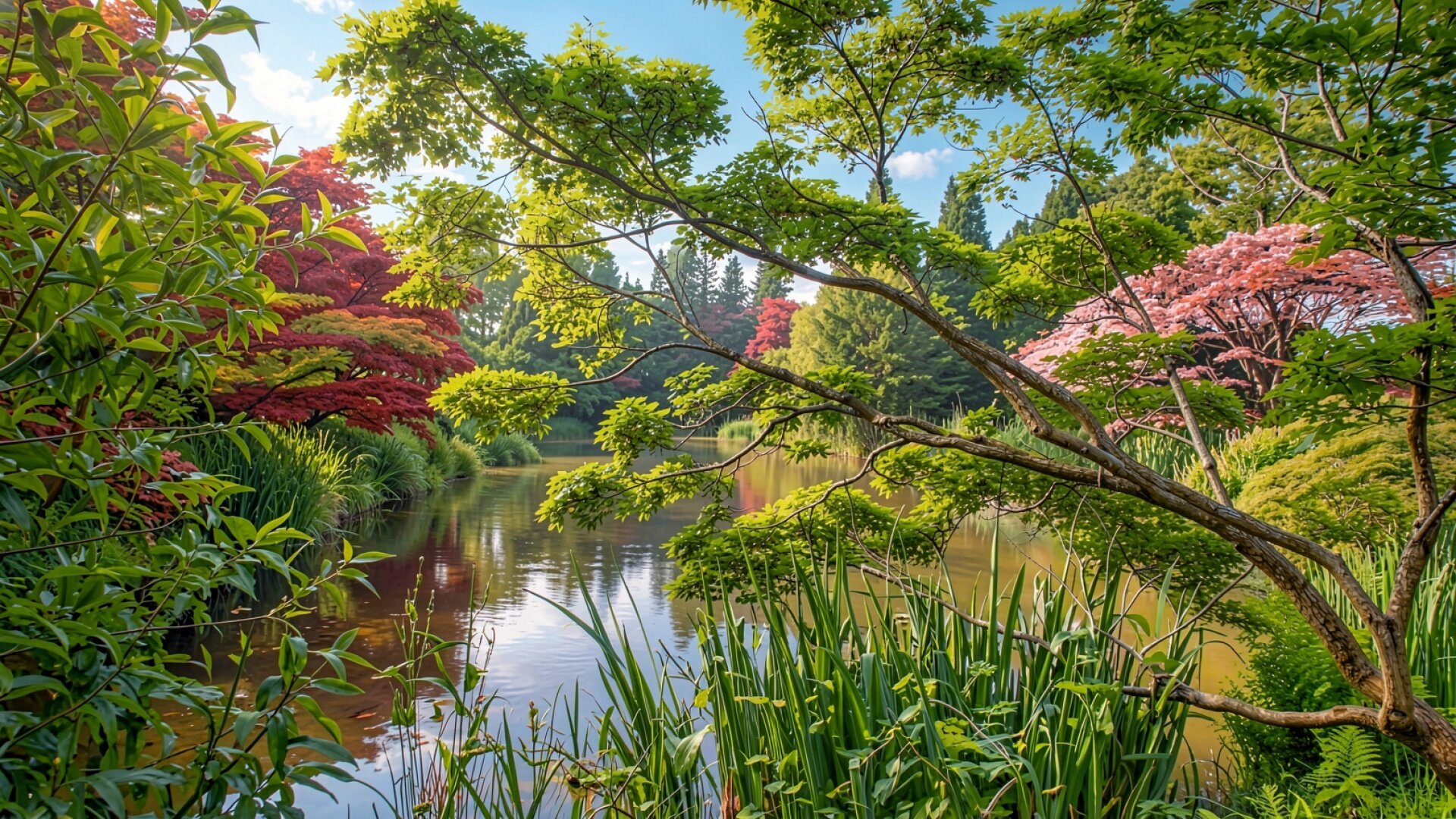 Японский сад с красными кленами у пруда
