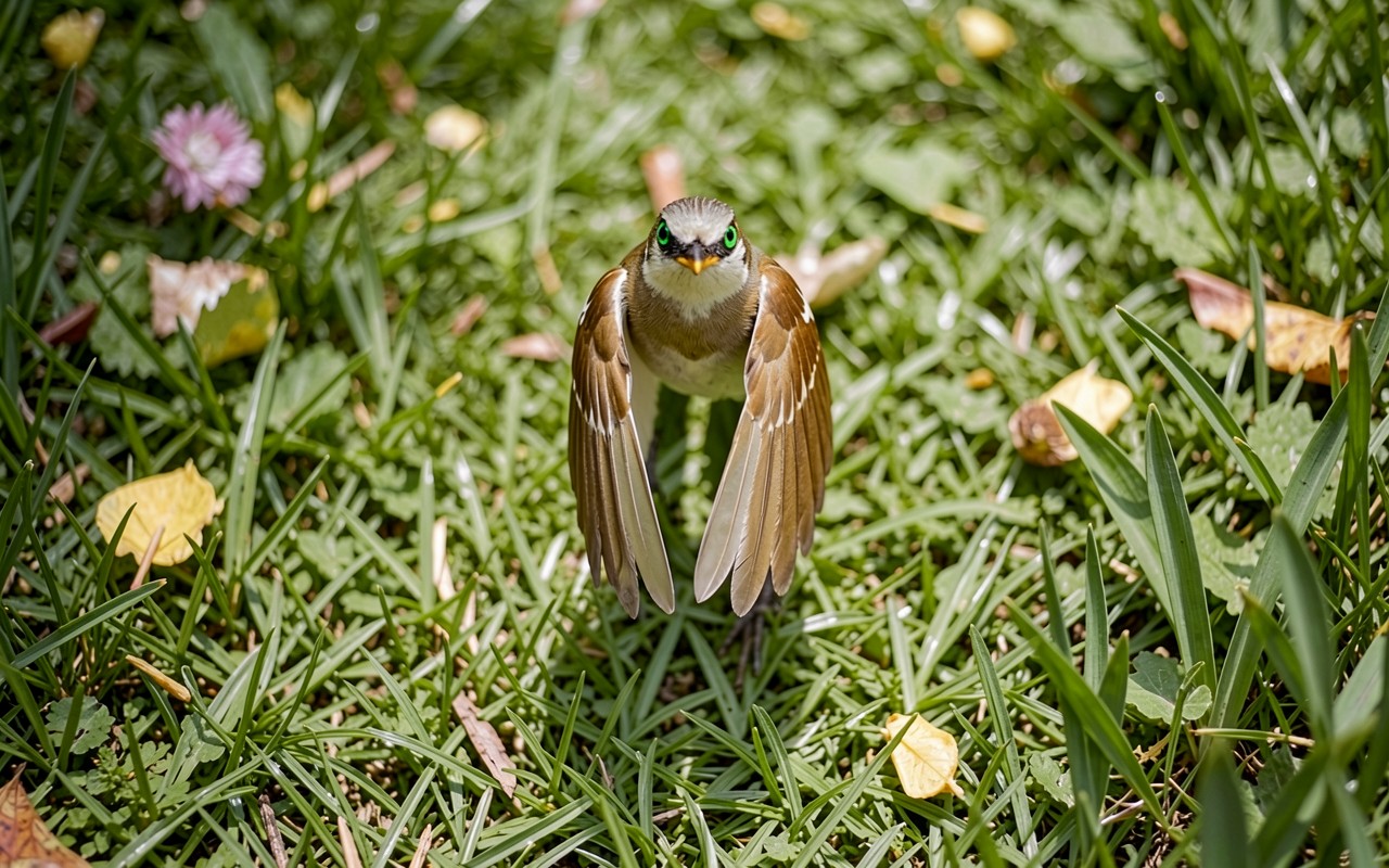 Маленькая коричневая птица с расправленными крыльями в траве
