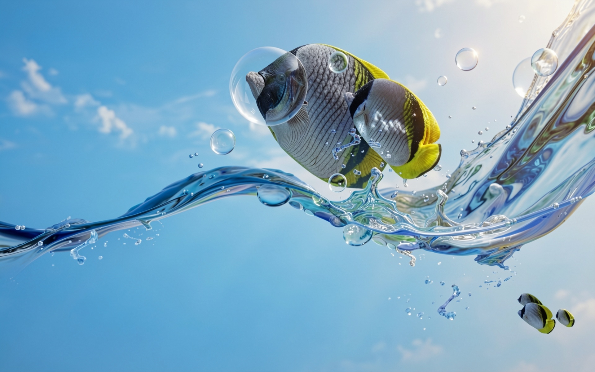Желтоперые рыбы в голубой воде с пузырями