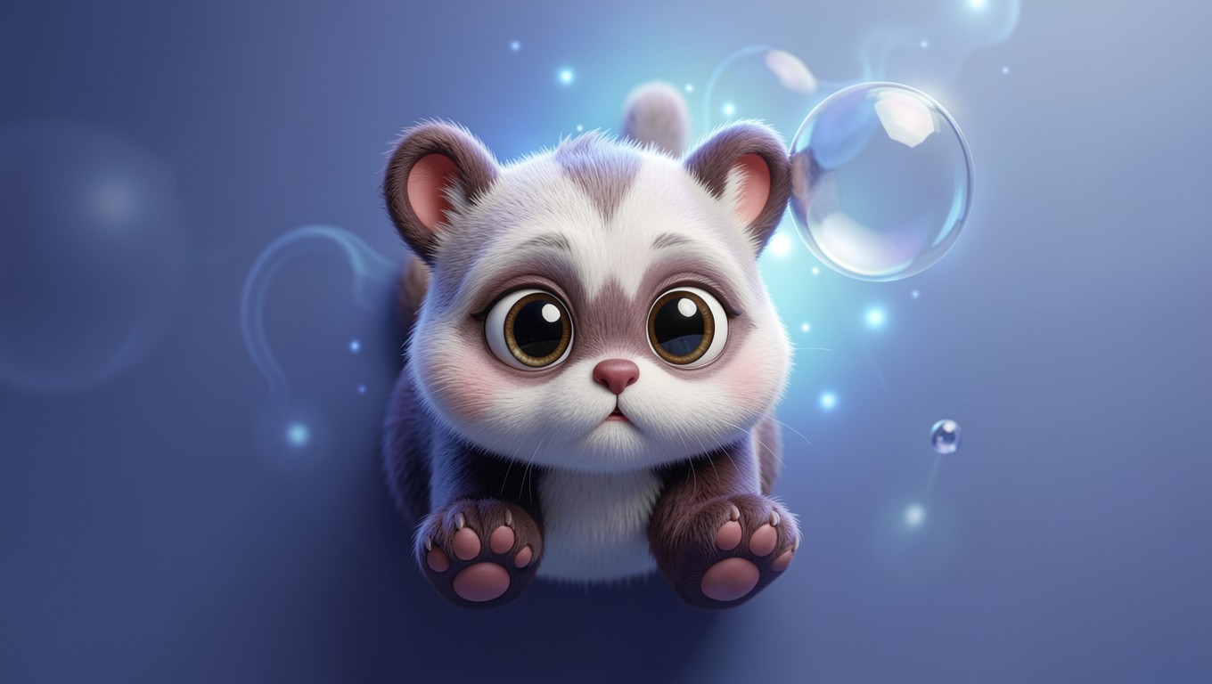 Милый енот с мыльными пузырями синий фон