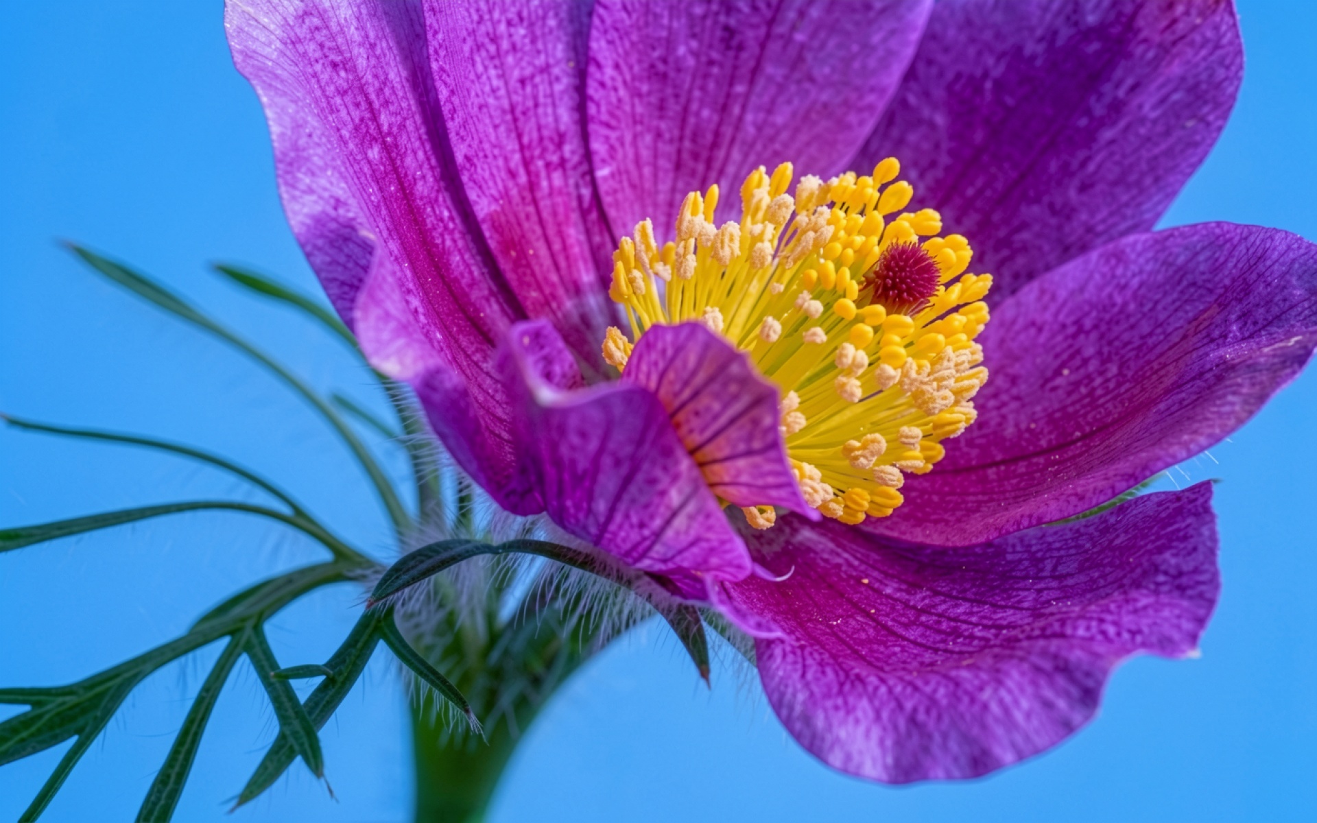 Пурпурный цветок прострела на голубом фоне