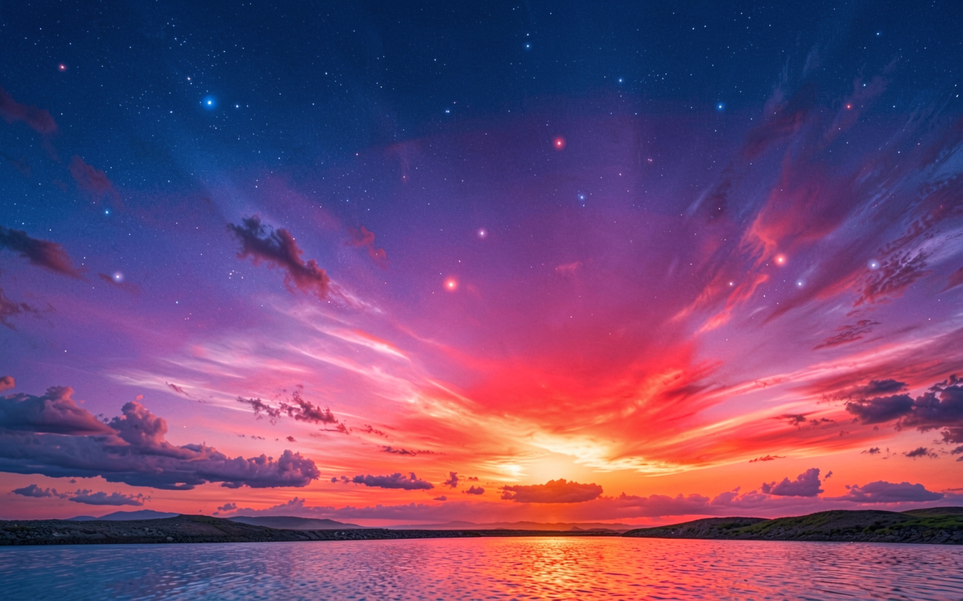 Звездное небо над океаном в пурпурных тонах