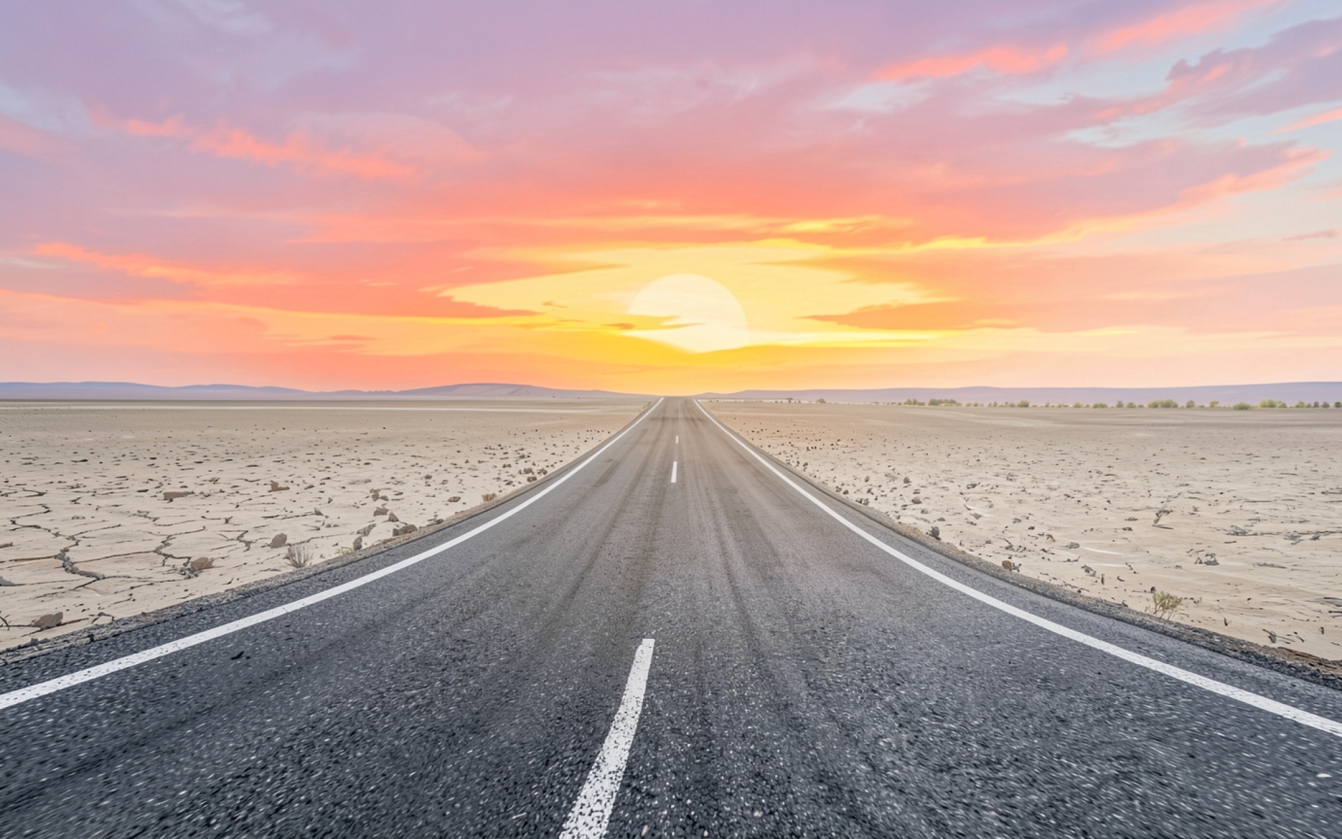 Прямая дорога в пустыне при закате