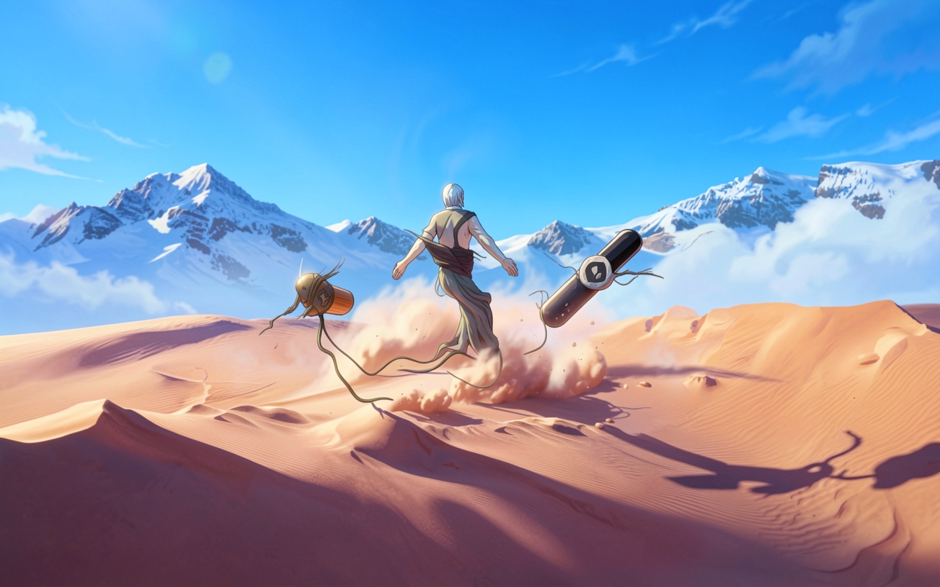 Беловолосый воин в пустыне на фоне гор