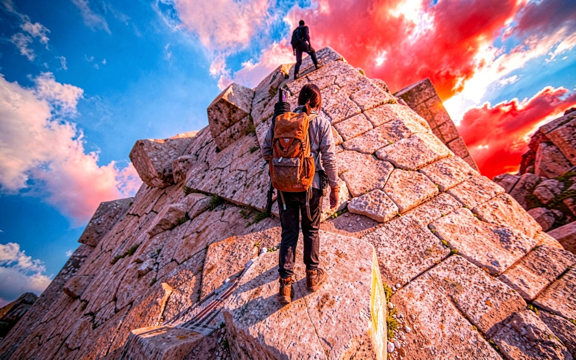 Путешественники на вершине каменной пирамиды закат