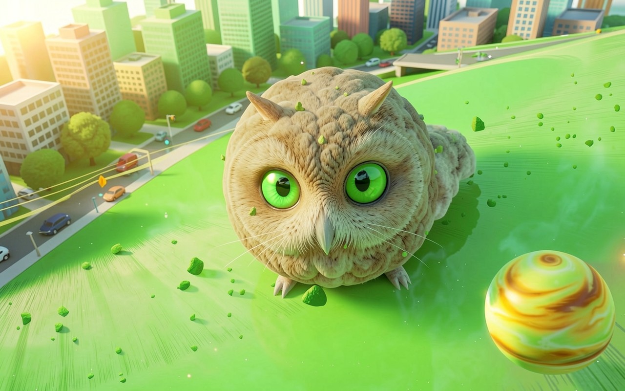 Пушистая сова с зелеными глазами в городе