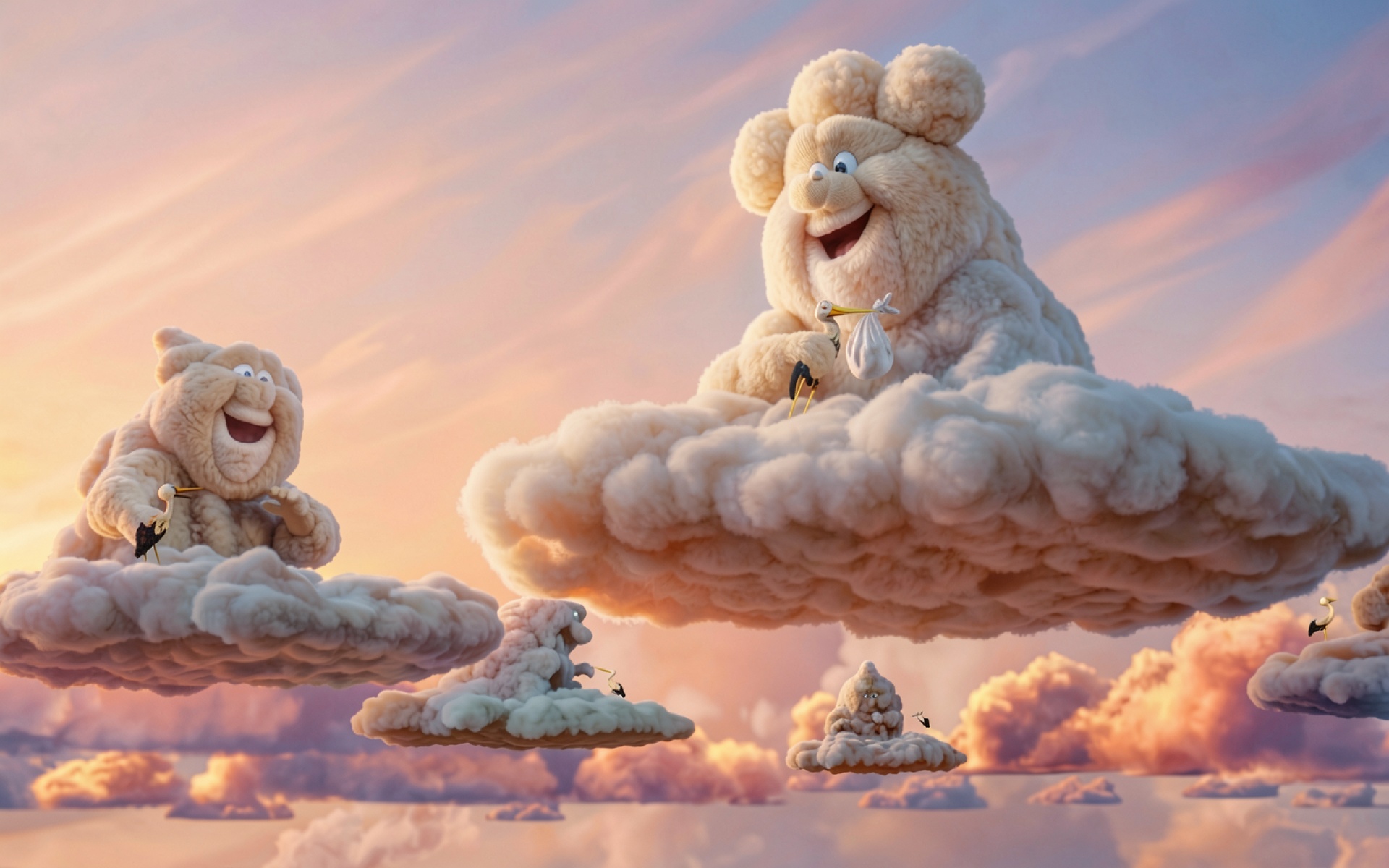 Пушистые существа на облаках в закатном небе