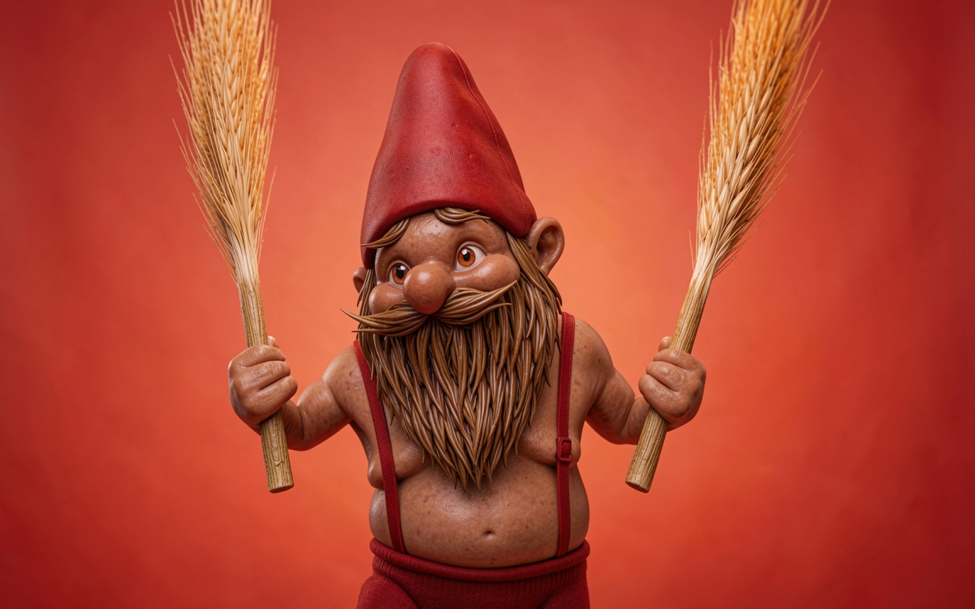 Садовый гном с колосьями пшеницы красный фон