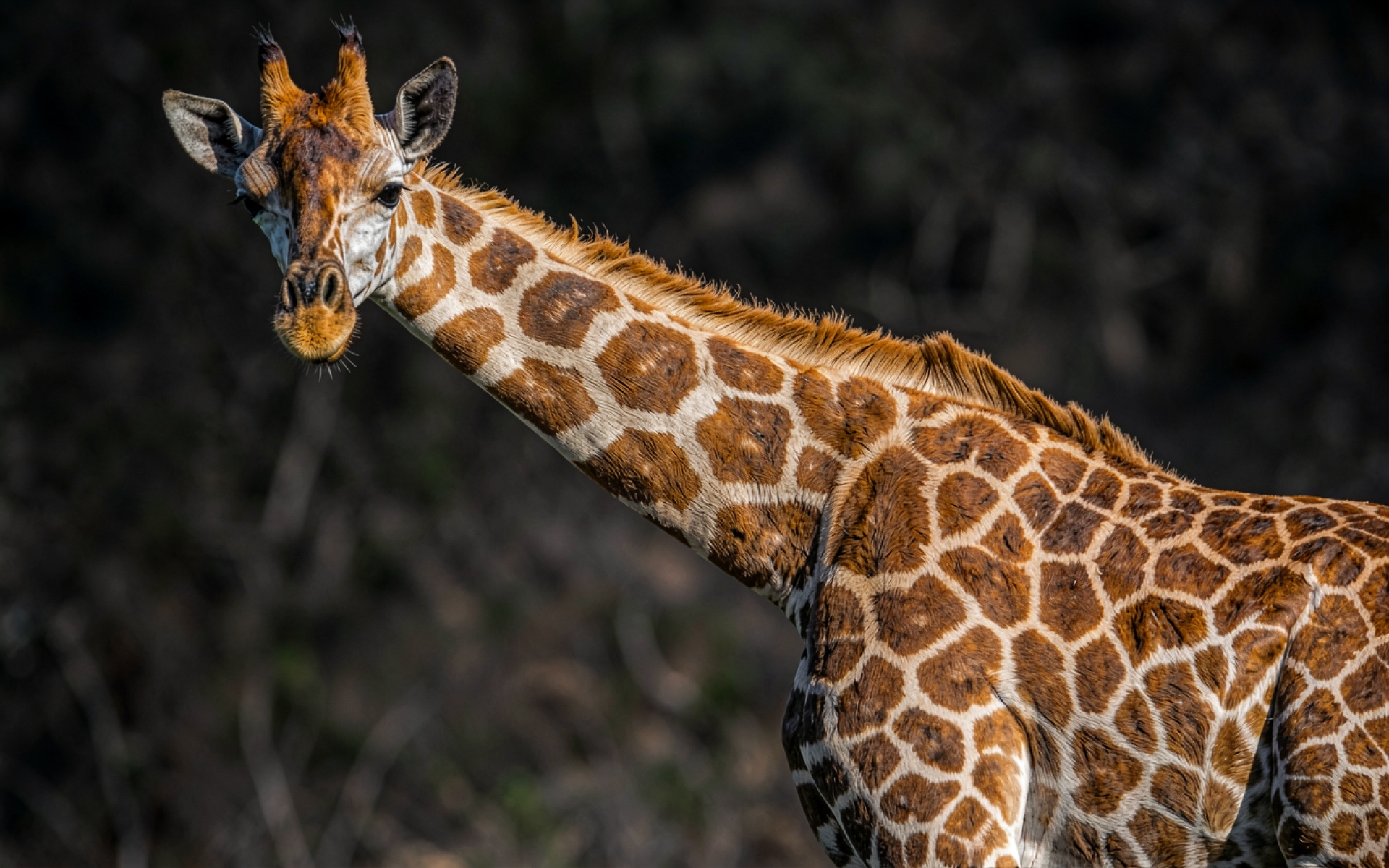 Жираф с рыжими пятнами в темном лесу