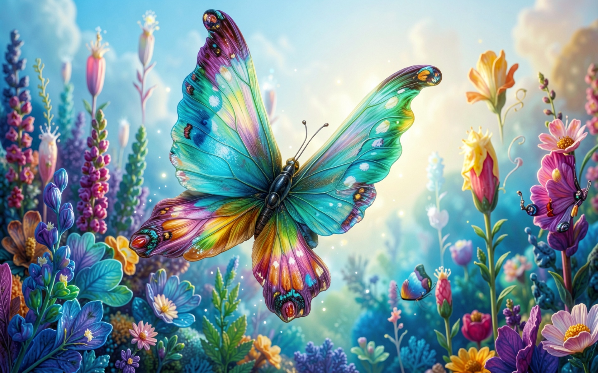Разноцветная бабочка в сказочном цветущем саду