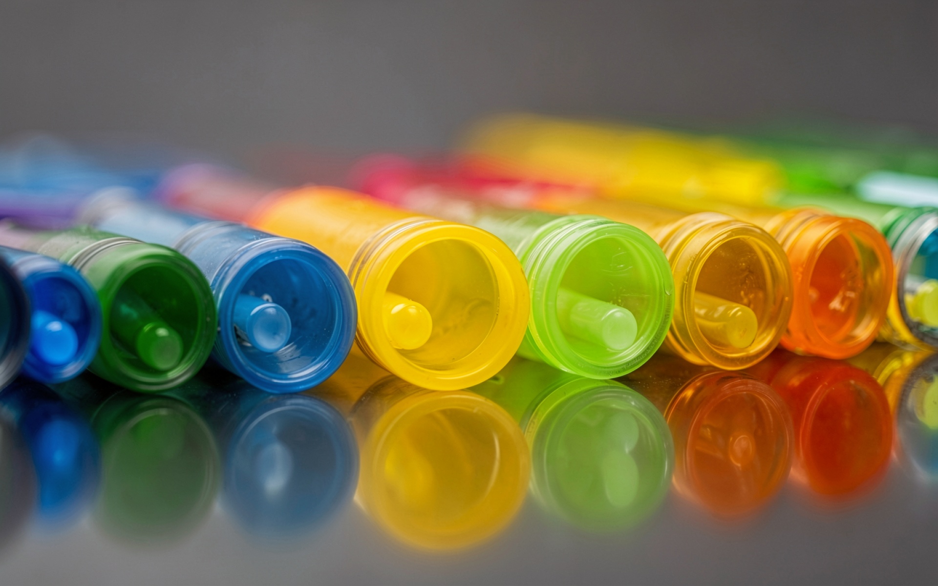 Разноцветные маркеры на зеркальной поверхности в макросъемке