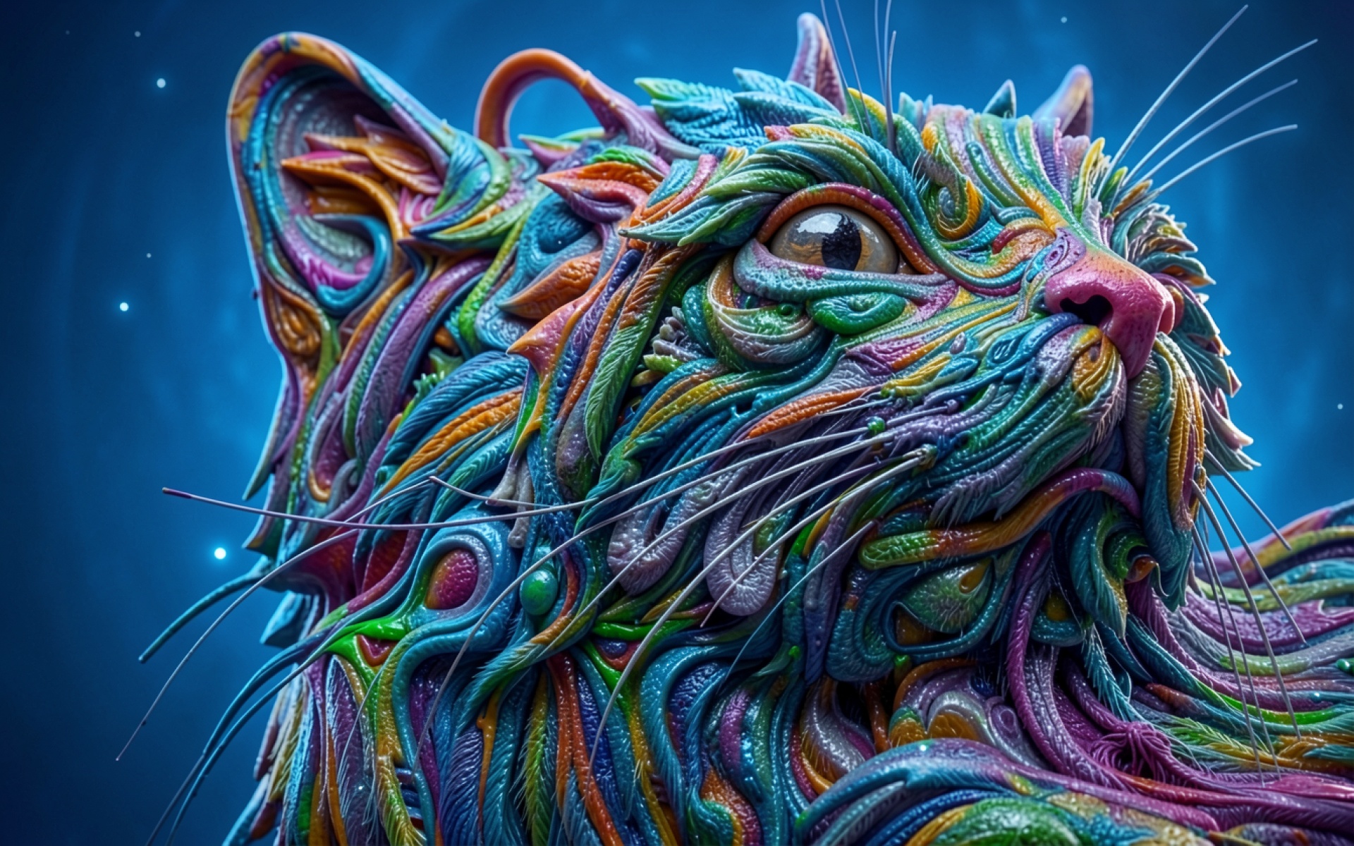 Разноцветный кот в сюрреалистичном стиле на синем фоне