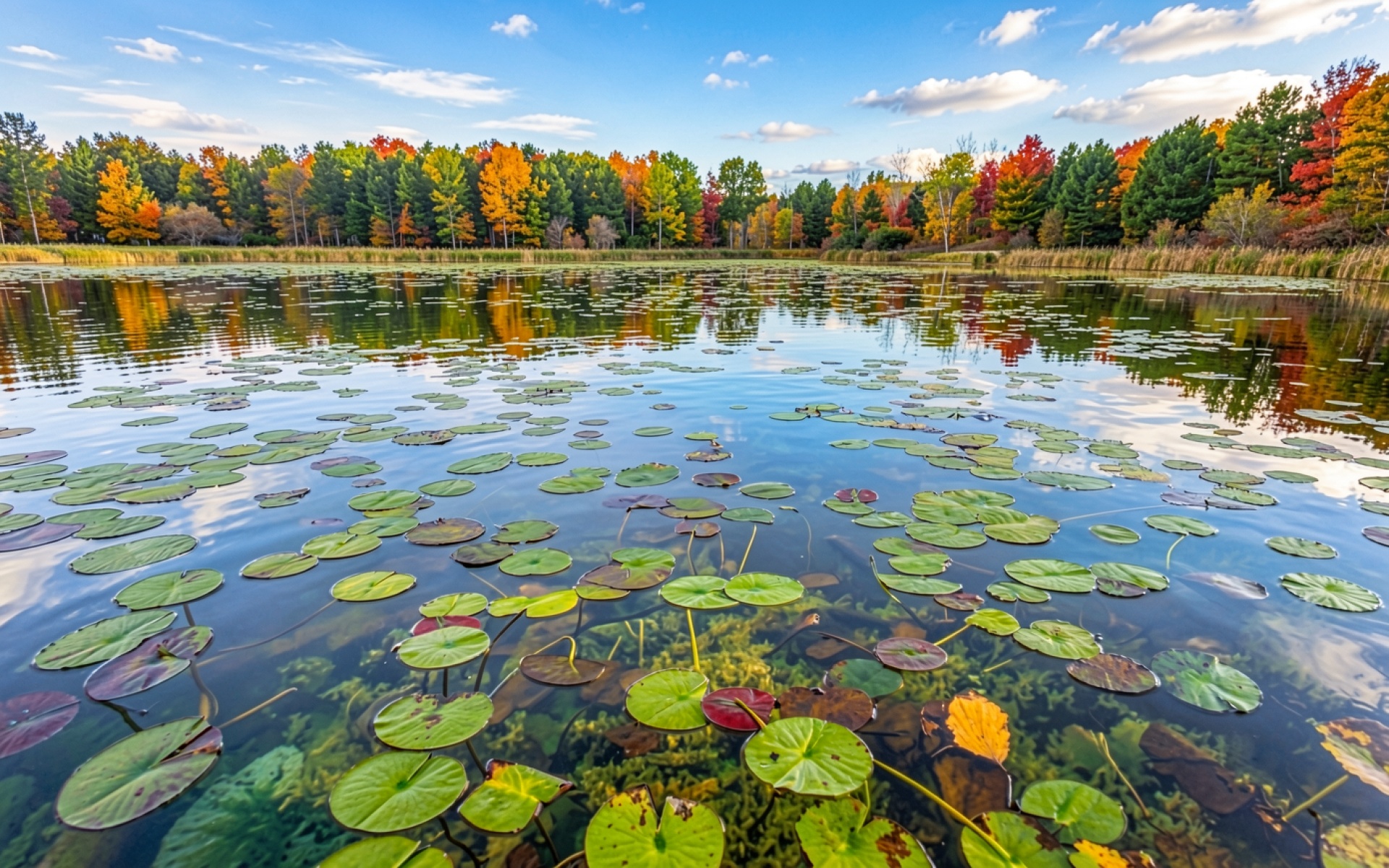 Осенний пруд с кувшинками и разноцветным лесом