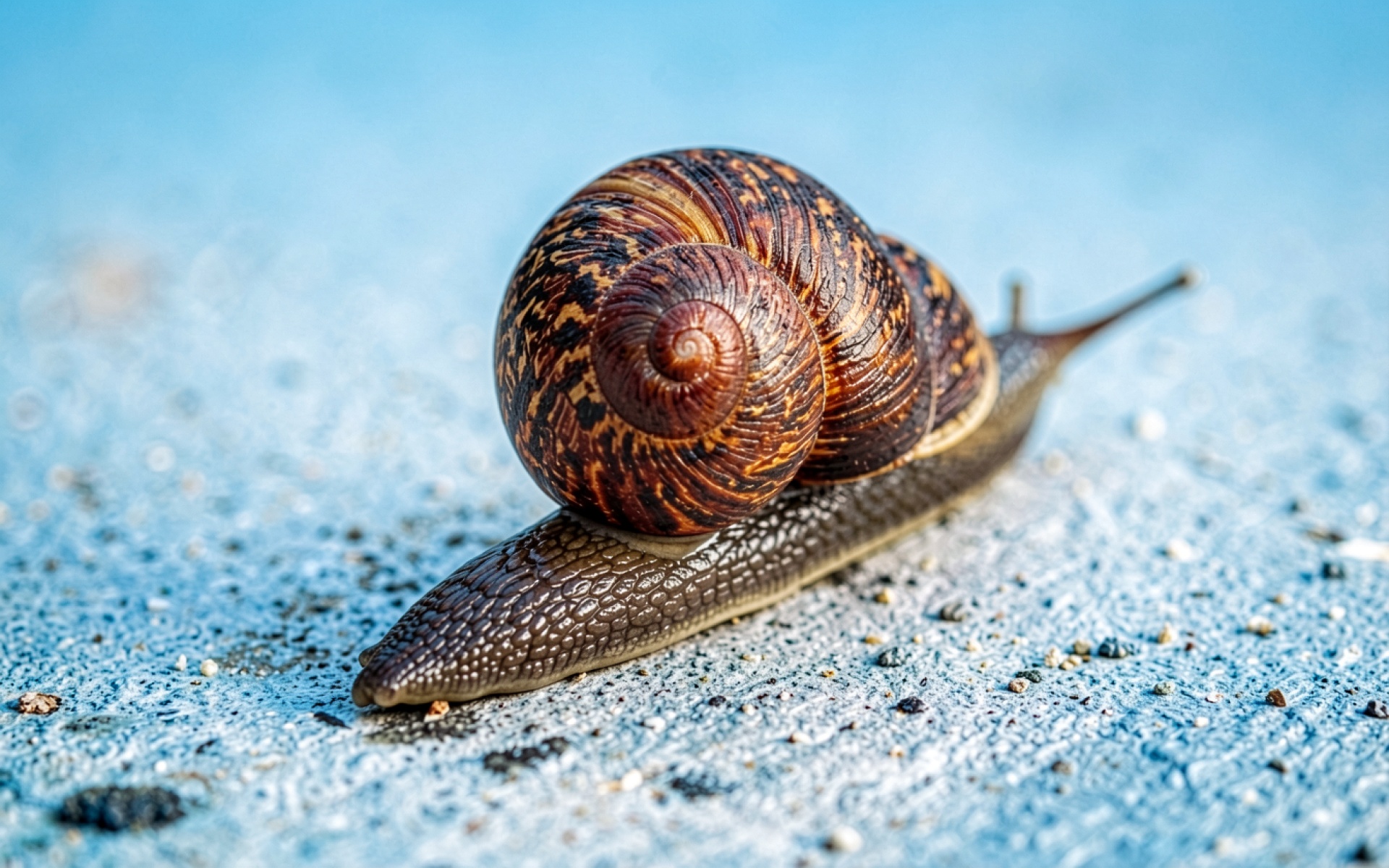 Улитка с коричневой раковиной на голубом фоне