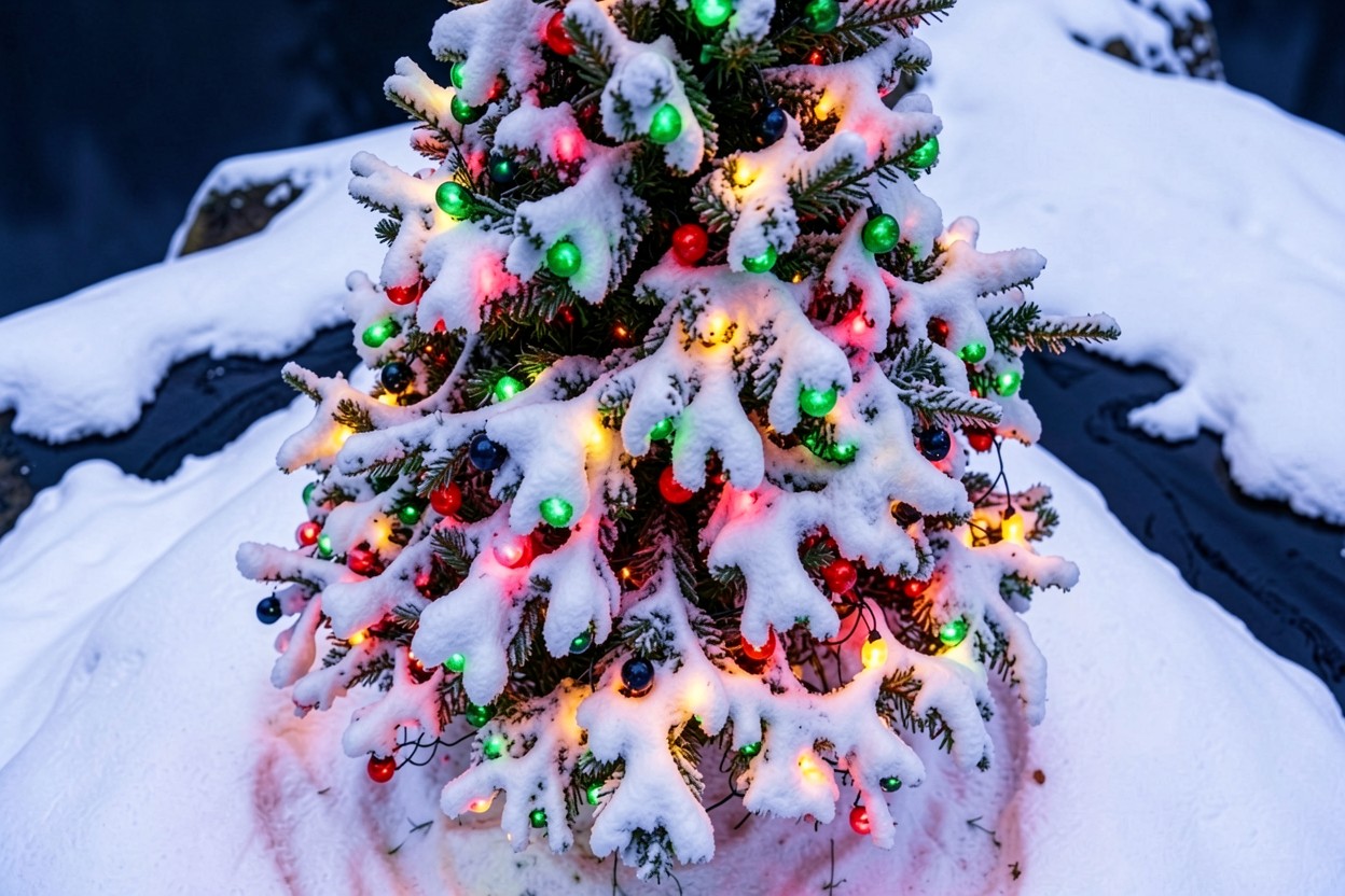 Заснеженная рождественская ель с разноцветными огнями
