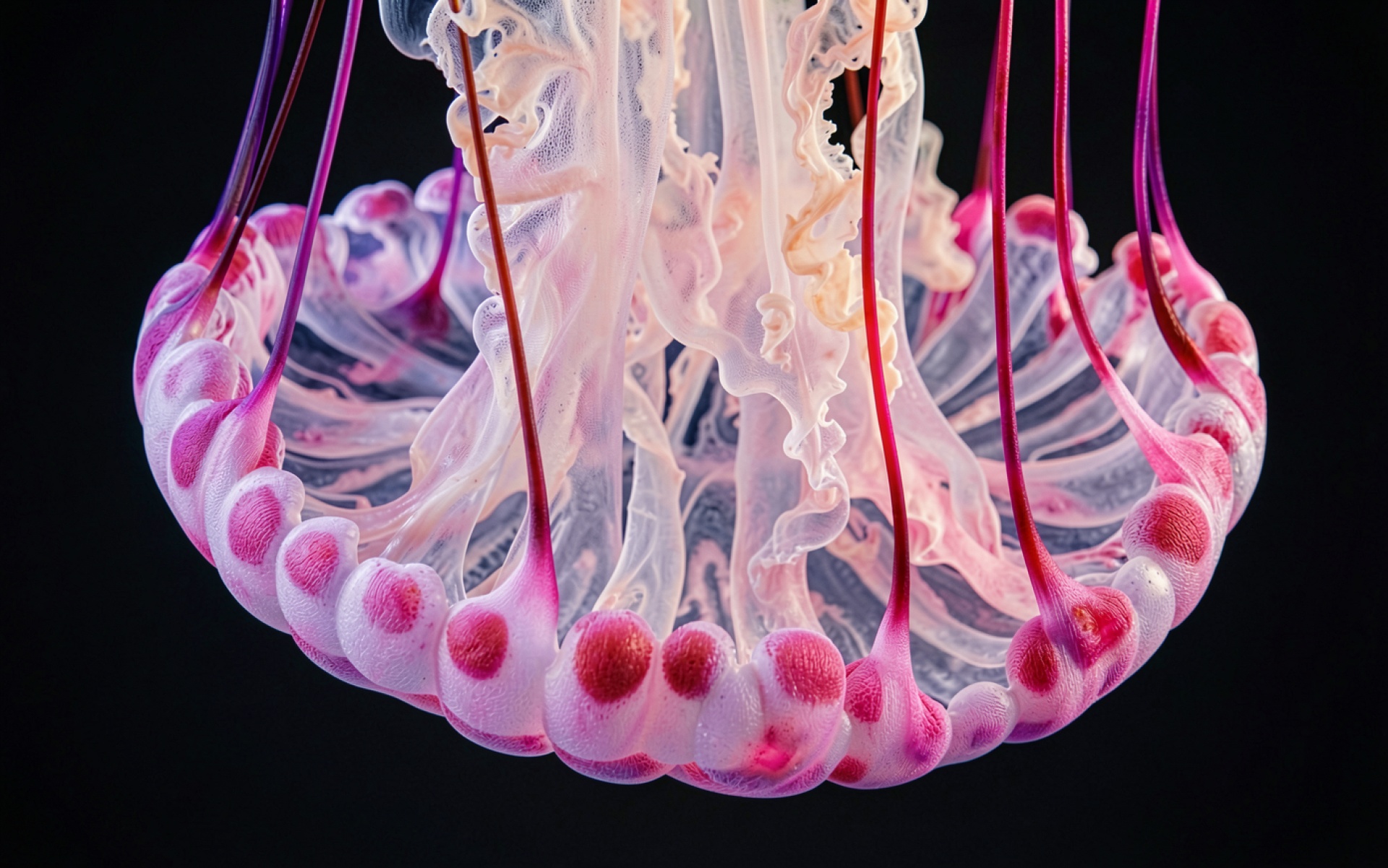 Розовая медуза на черном фоне макро