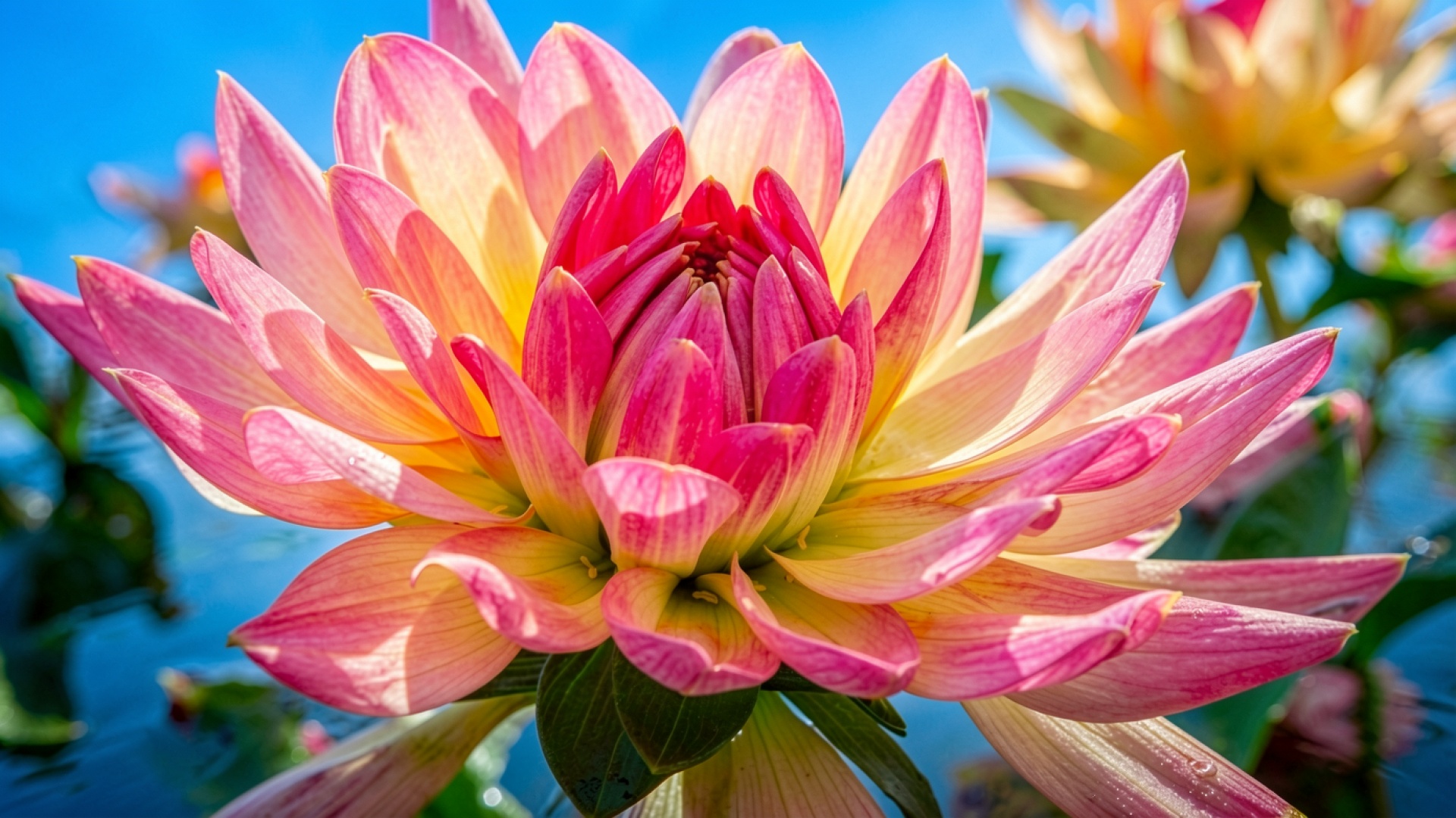 Розово-желтая георгина на фоне синего неба