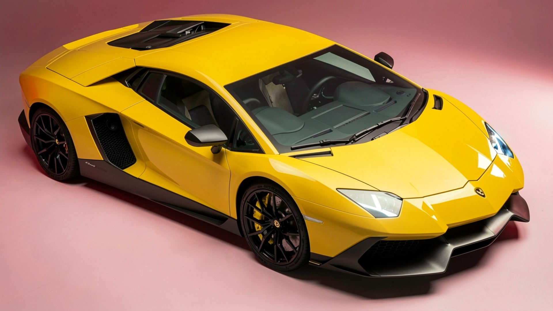 Желтый суперкар Lamborghini в минималистичной розовой студии