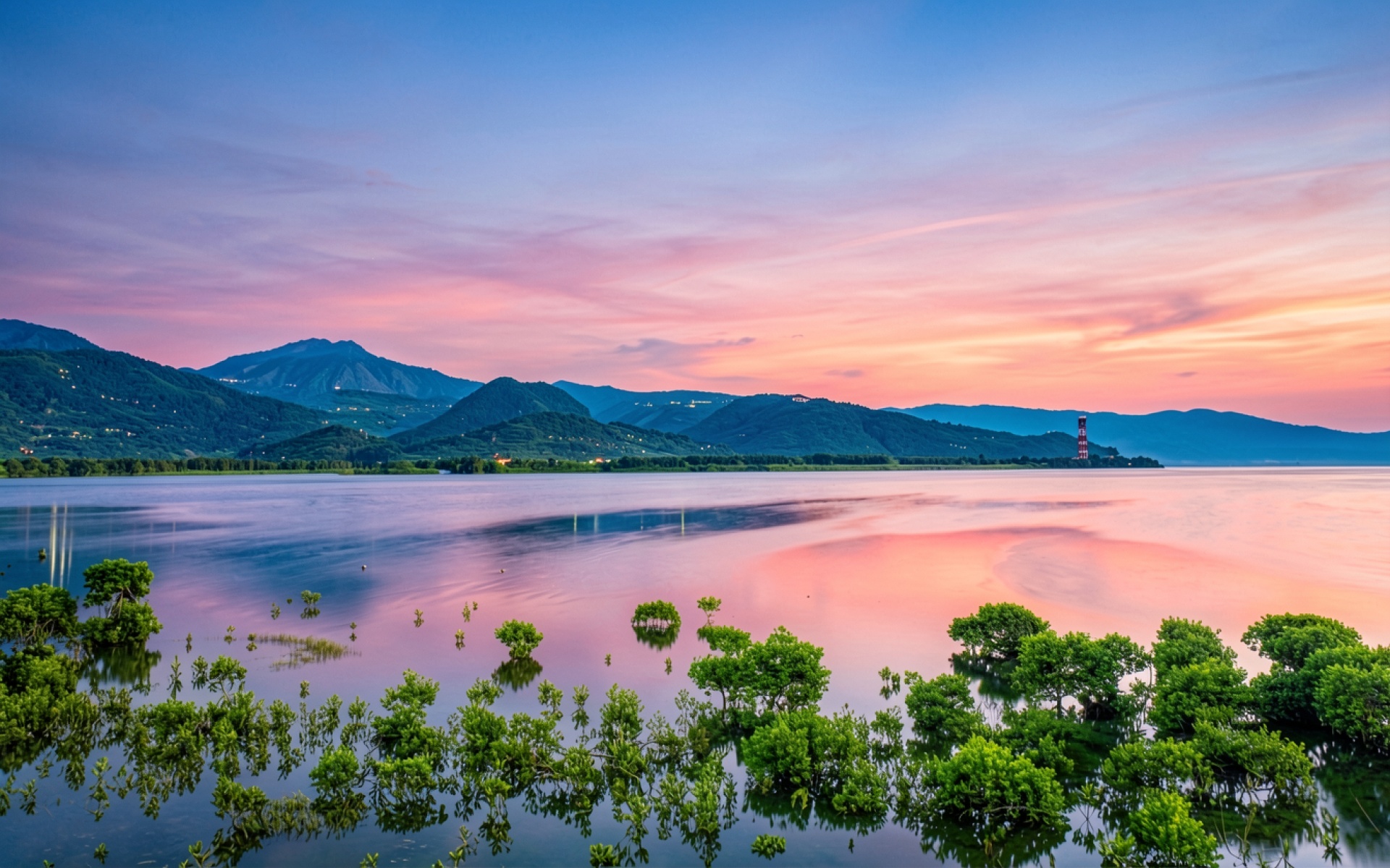 Пейзаж озера с горами в розовом закате