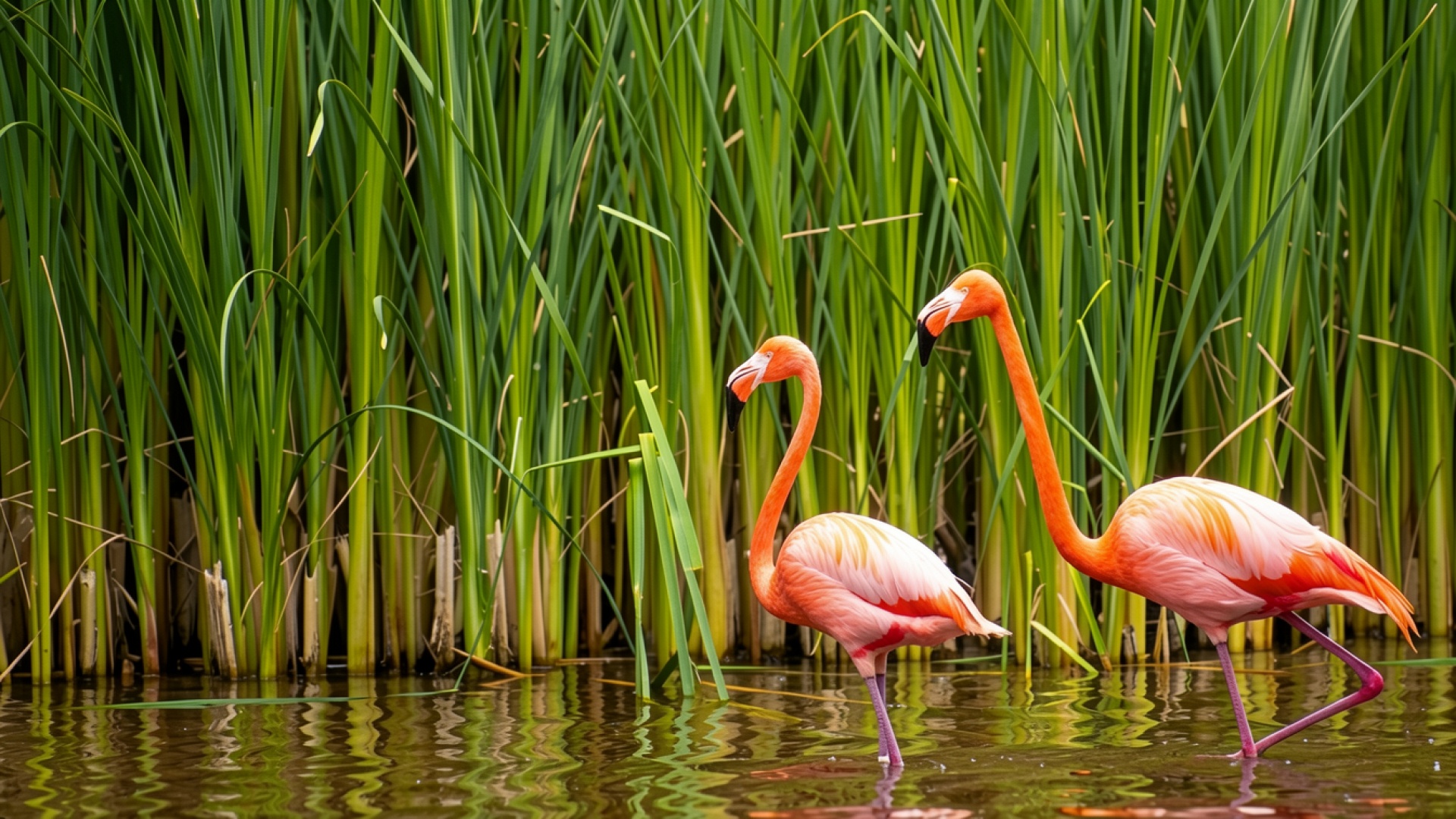 Розовые фламинго в зеленых зарослях камыша