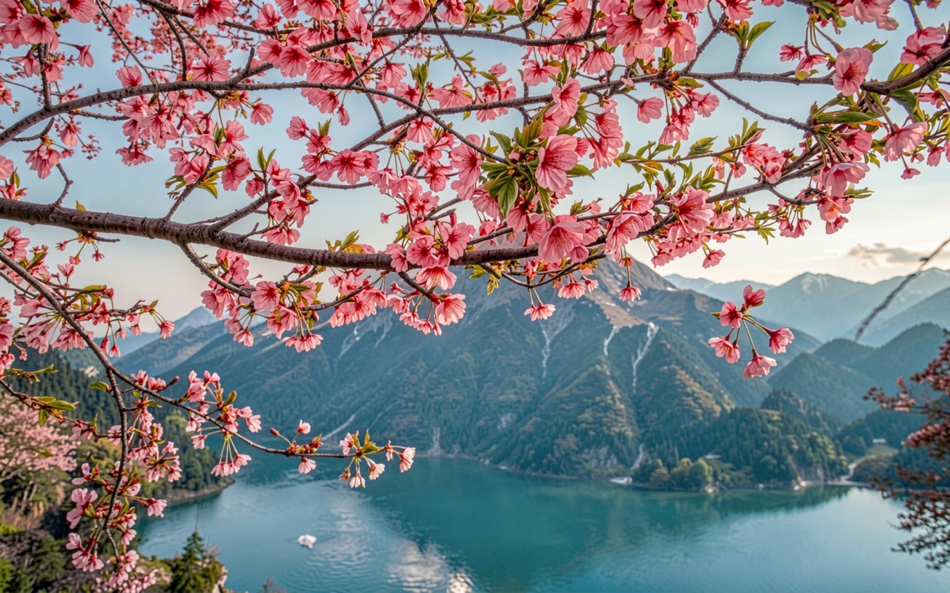 Розовые цветы сакуры на фоне горного озера