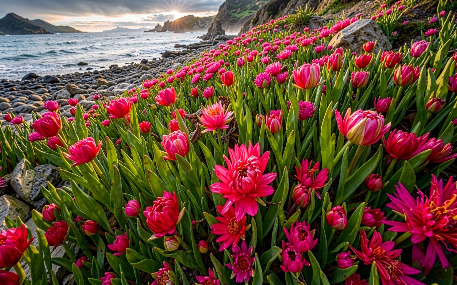 Розовые тюльпаны на каменистом берегу океана