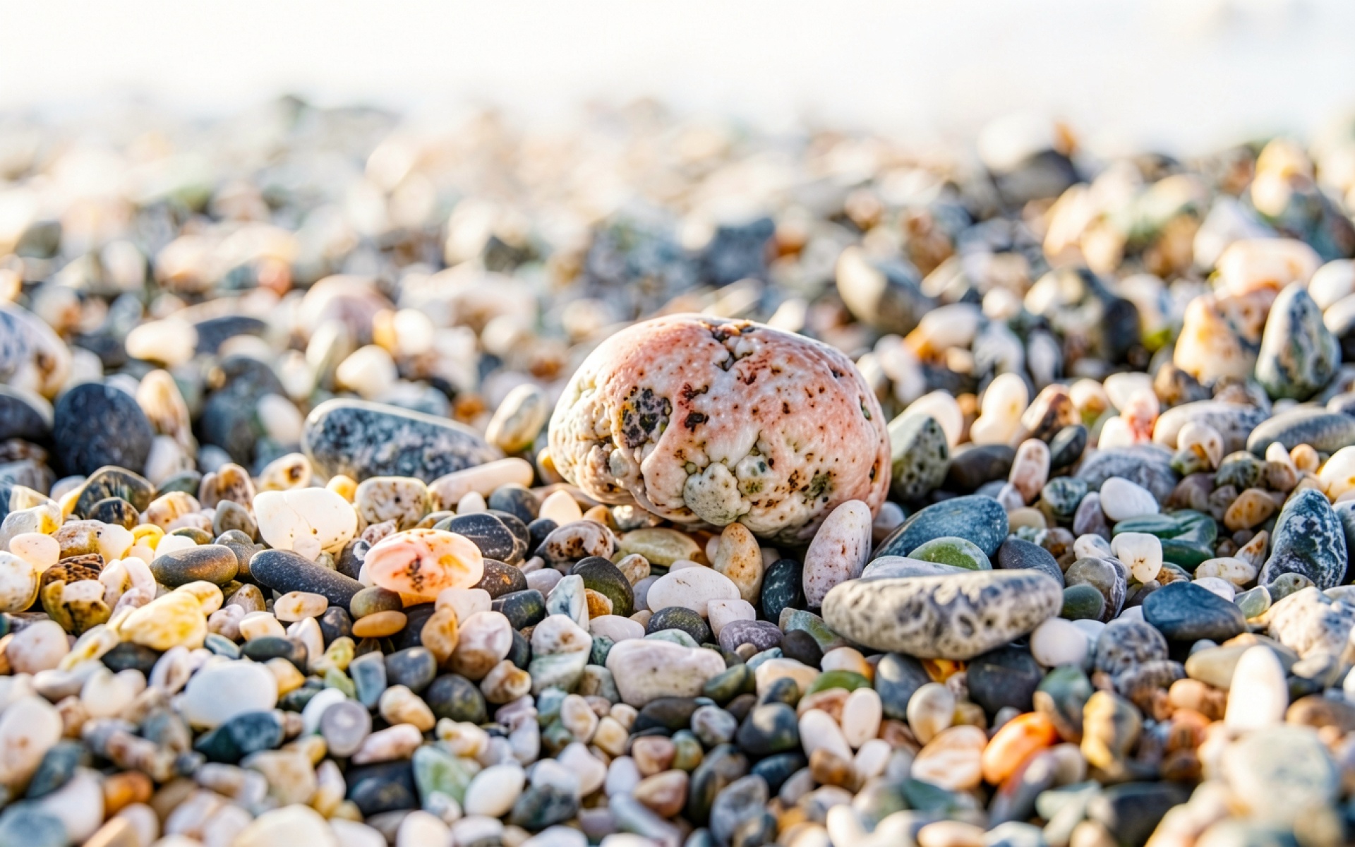 Розовый морской камень на сером галечном пляже