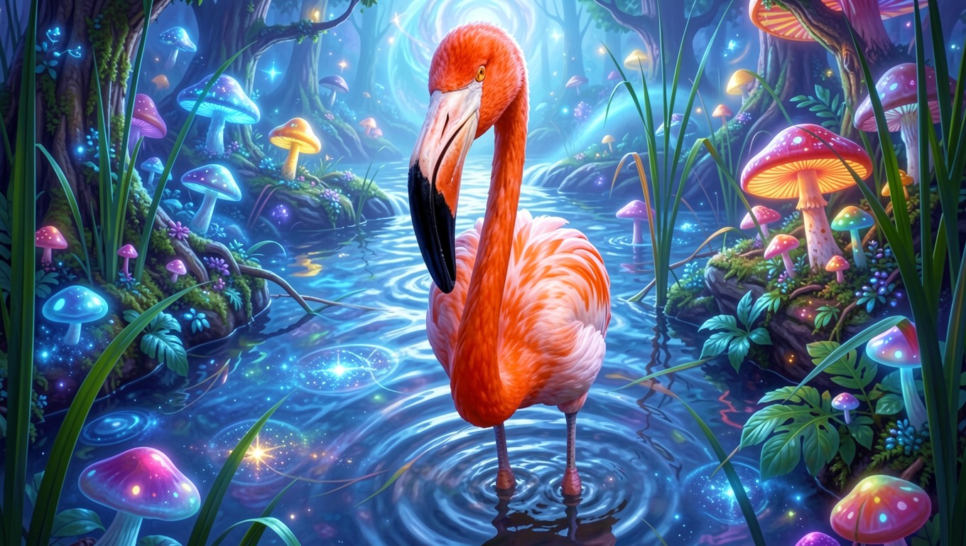 Розовый фламинго в неоновом лесу с грибами