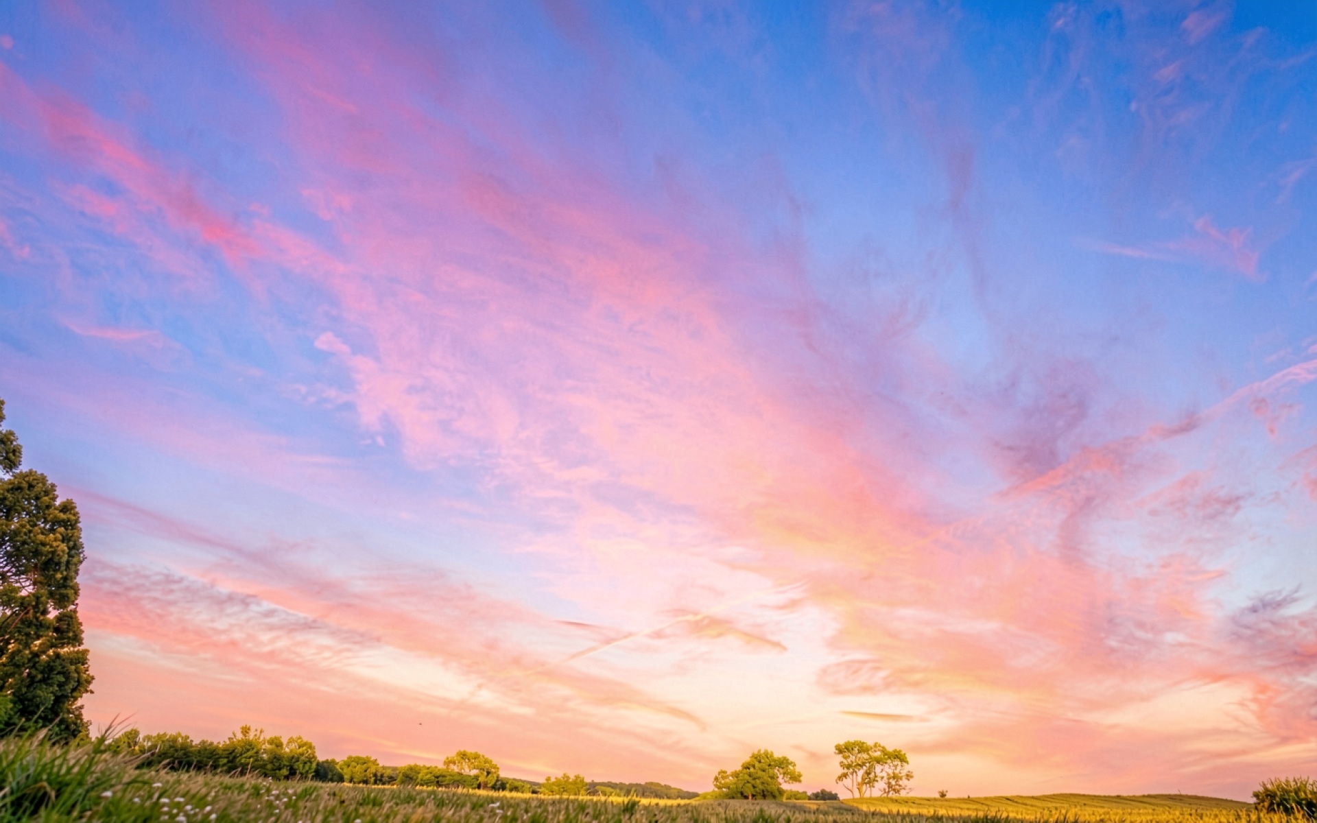 Закат в поле с розовыми облаками