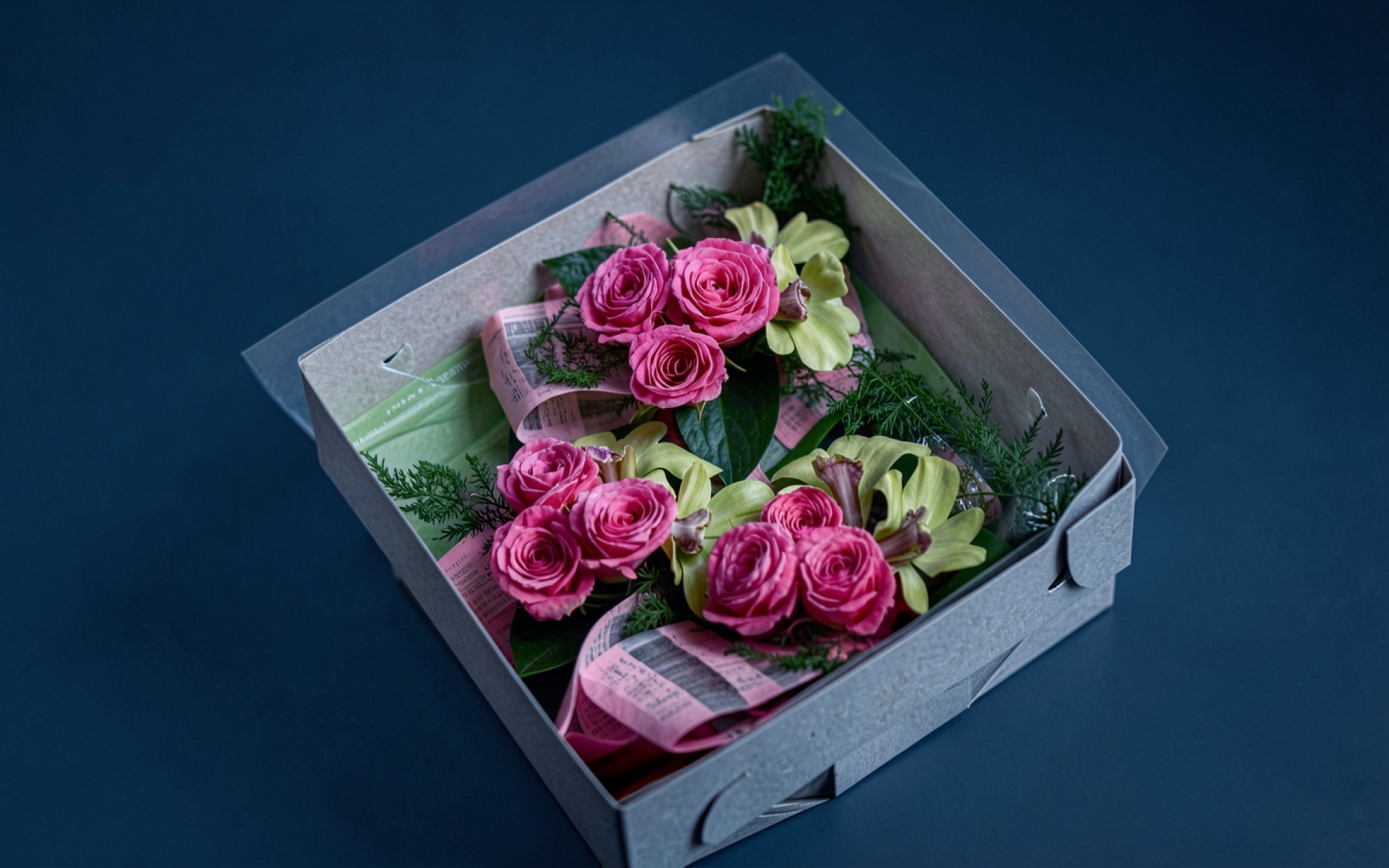 Букет розовых роз в серой картонной коробке