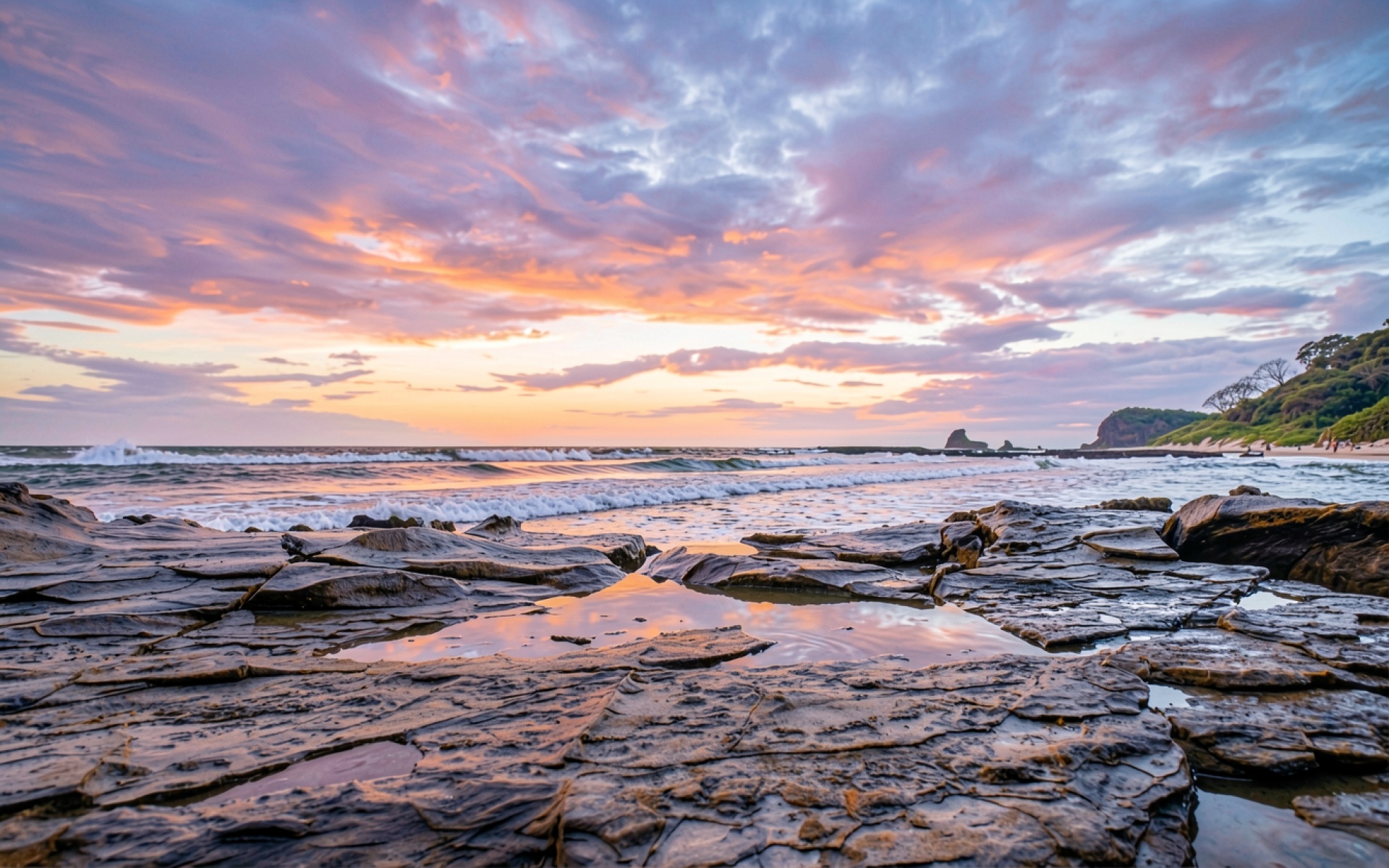 Закат над скалистым берегом океана в розовых тонах