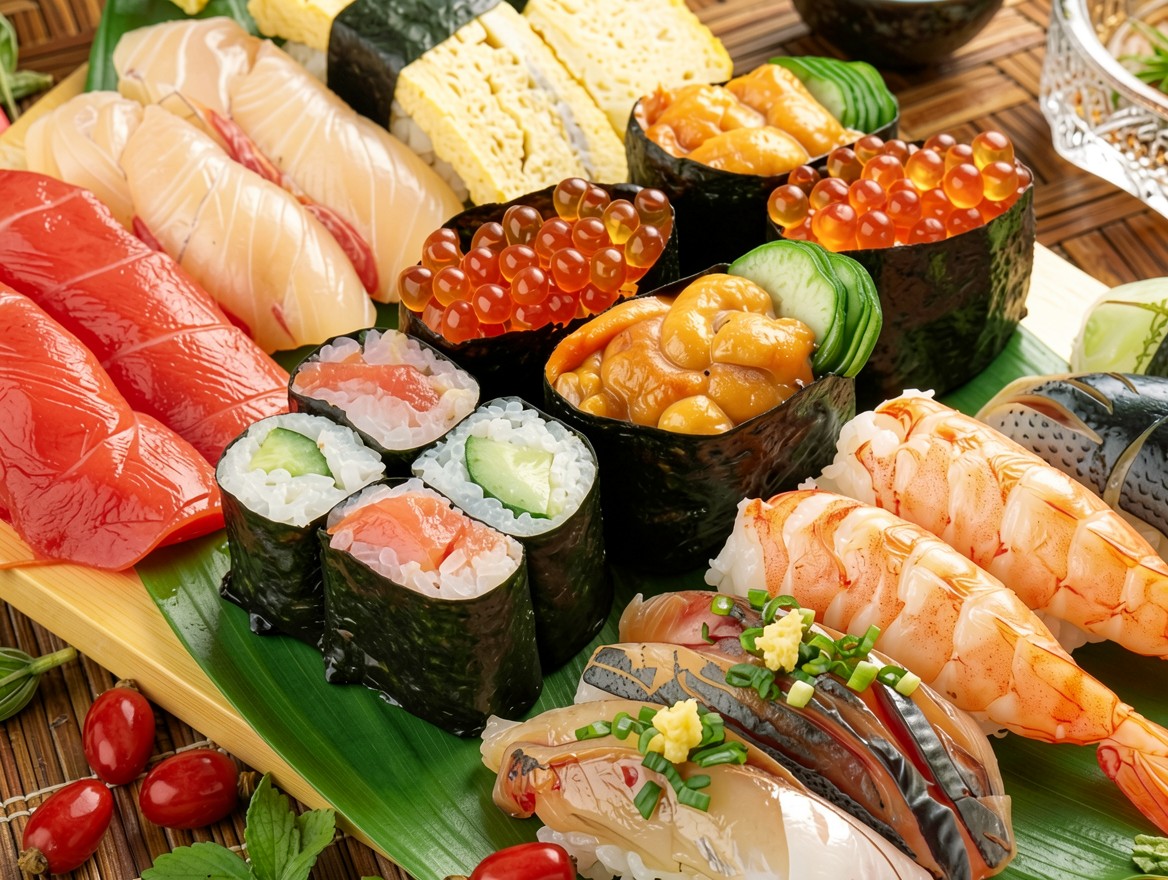 Набор суши и роллов на зеленом листе