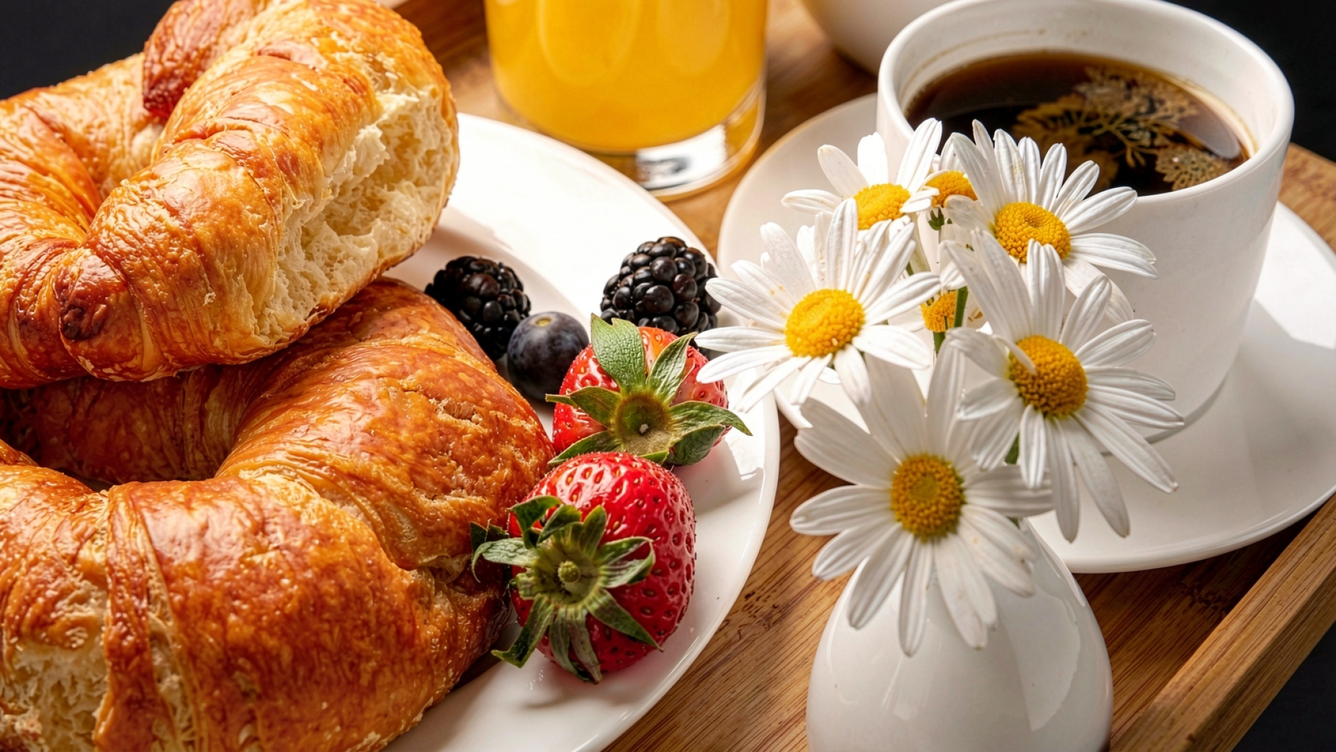 Завтрак с круассанами ягодами и белыми ромашками