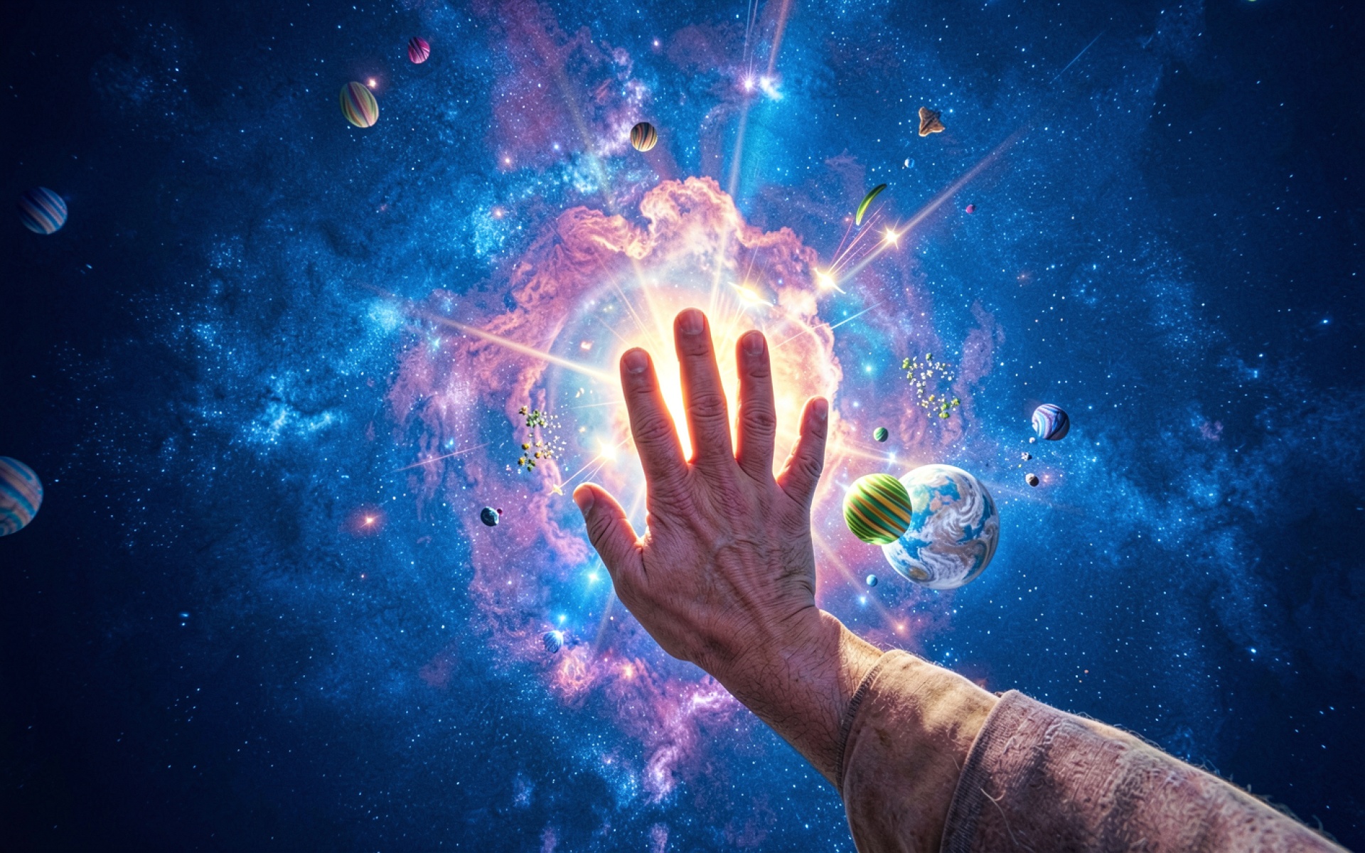 Рука человека в центре сияющей галактики