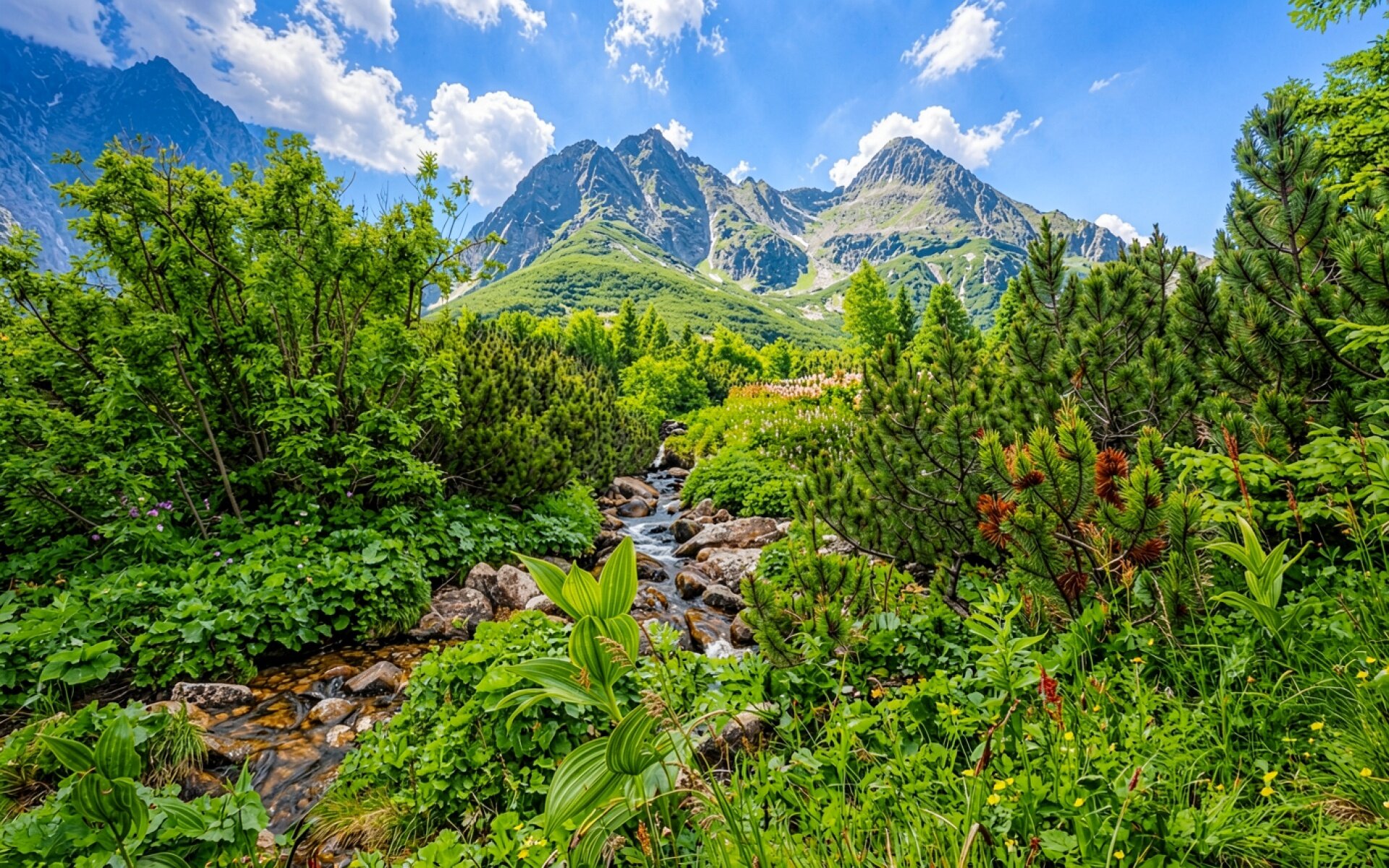 Горный ручей в зеленом лесу Татр