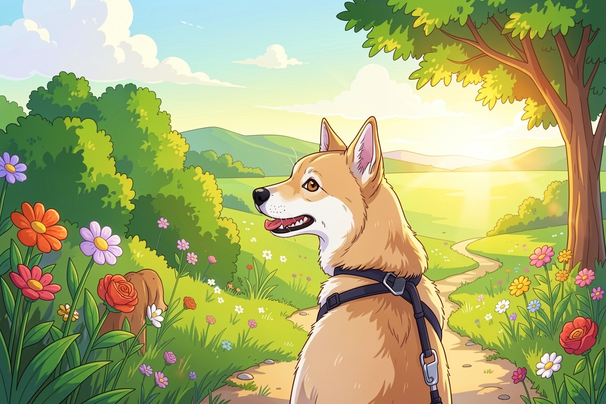 Рыжая собака корги в летнем цветущем саду