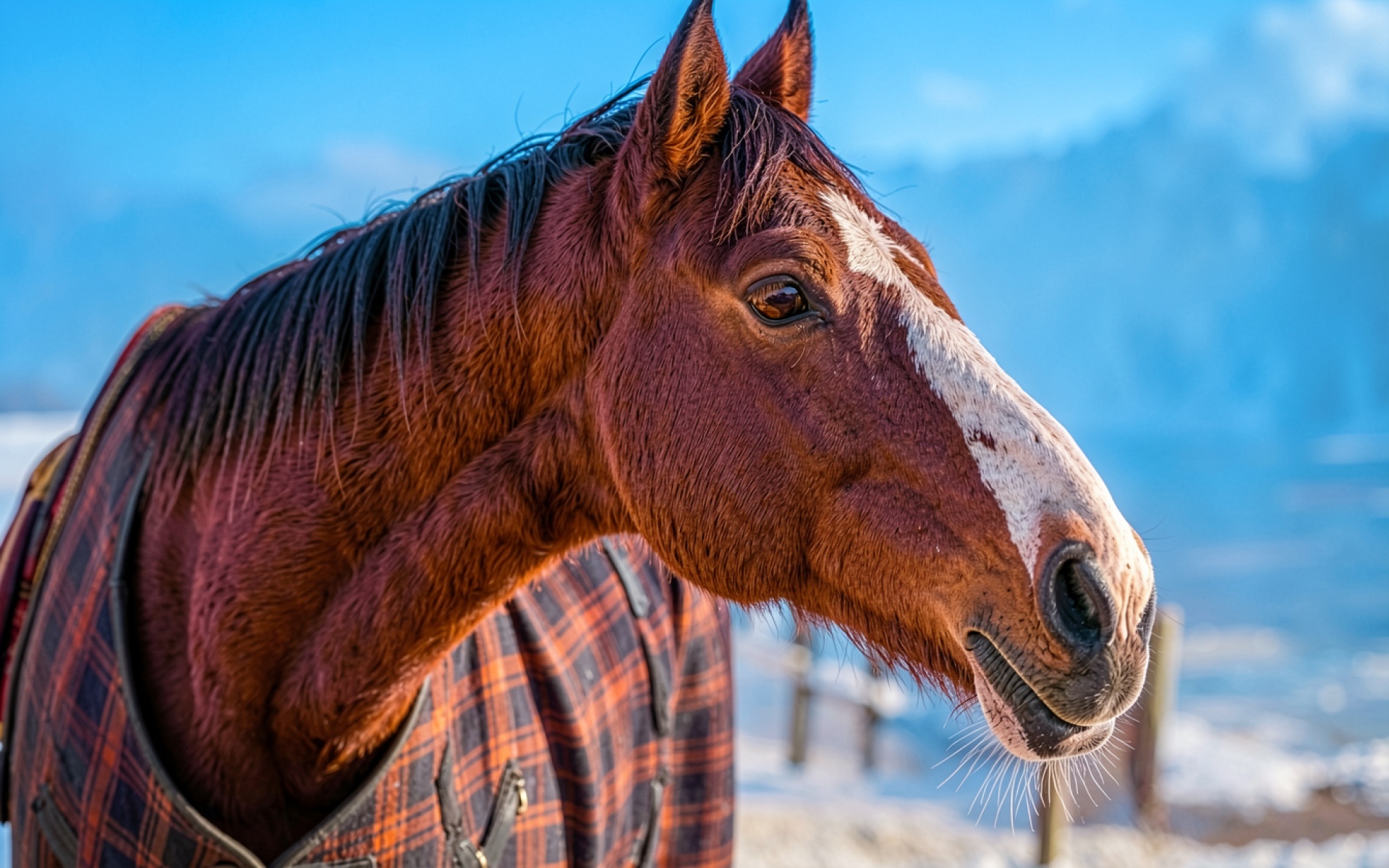 Рыжая лошадь в клетчатом попоне зимой
