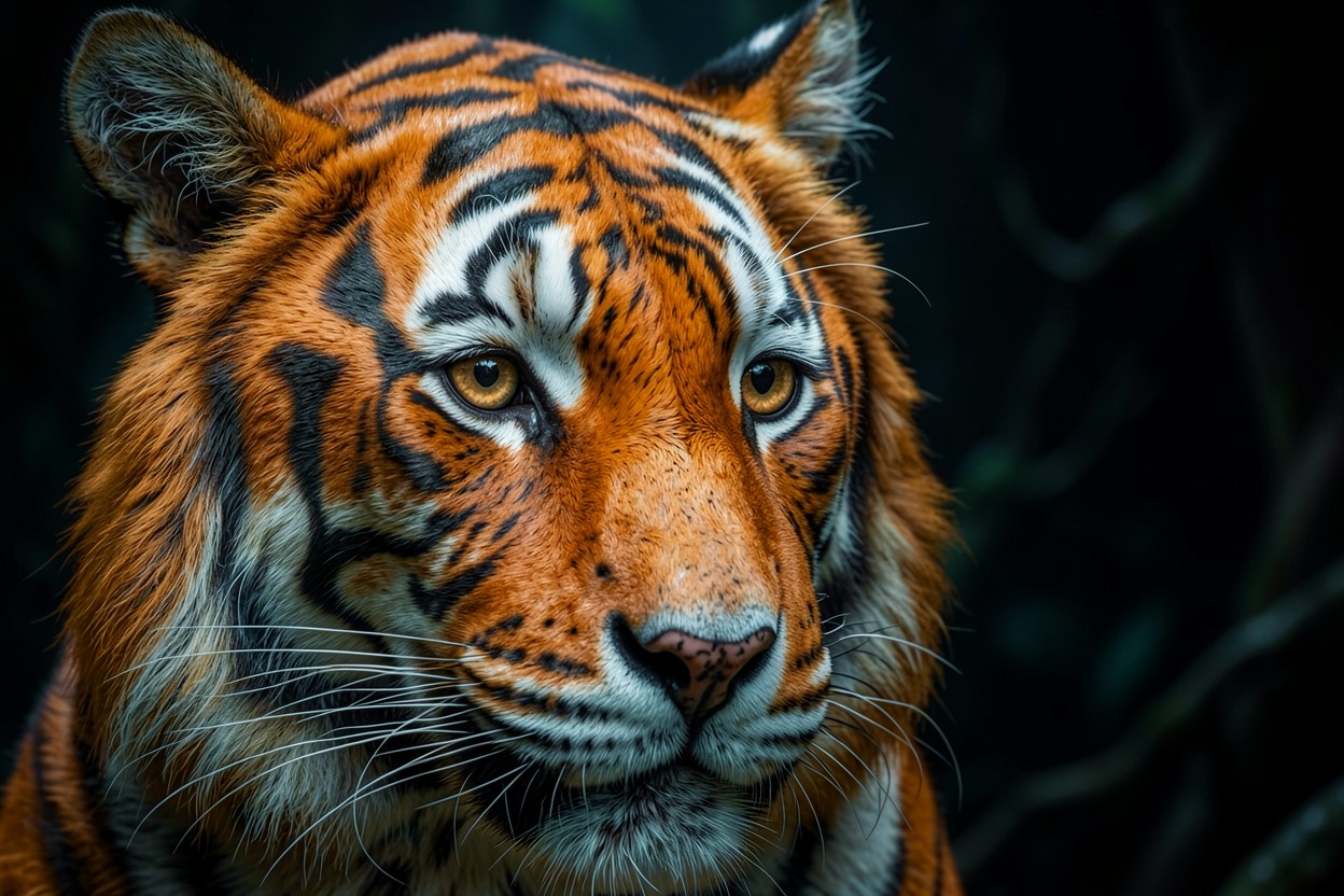 Портрет рыжего тигра в темных джунглях