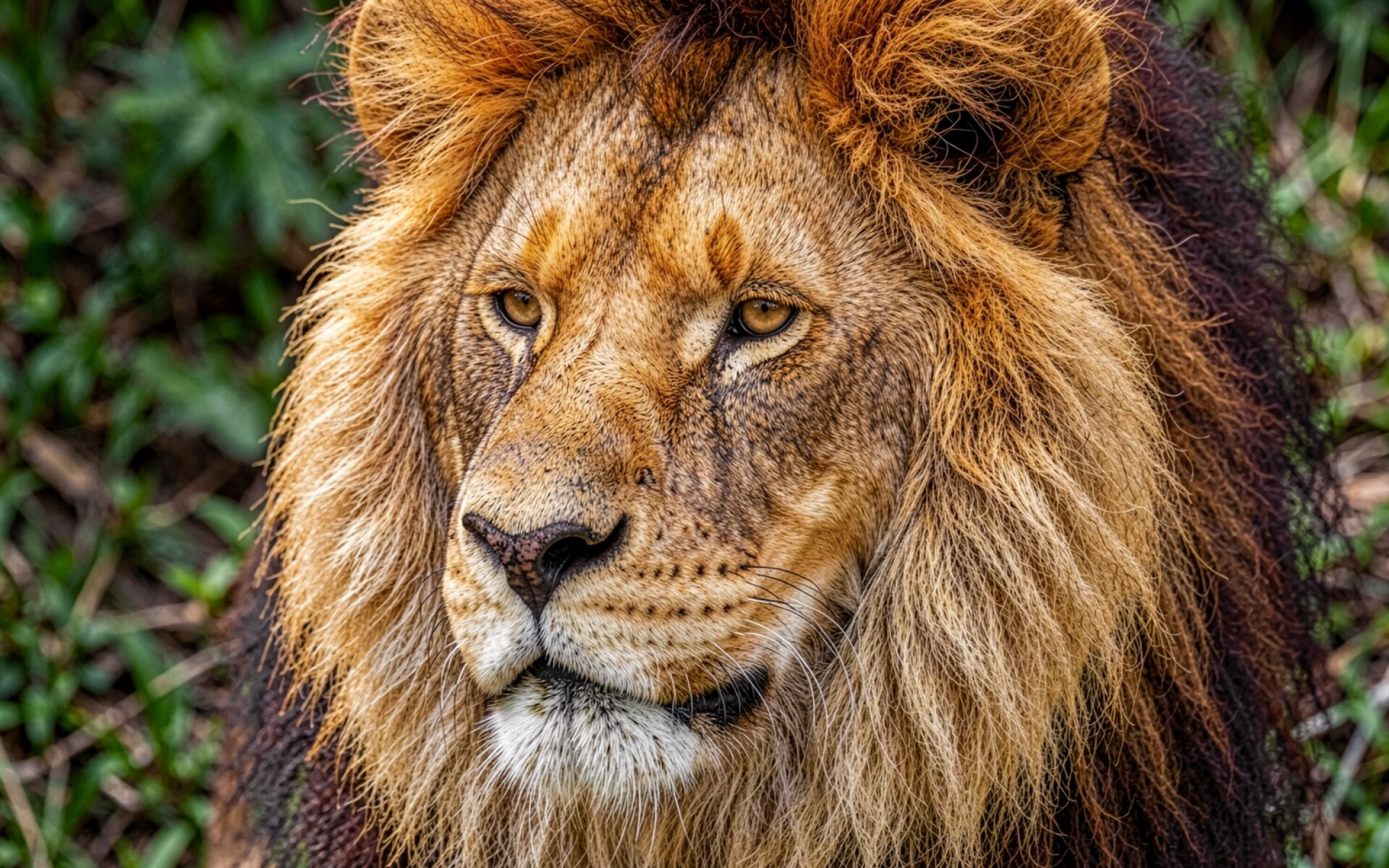 Лев с рыжей гривой в зеленом лесу